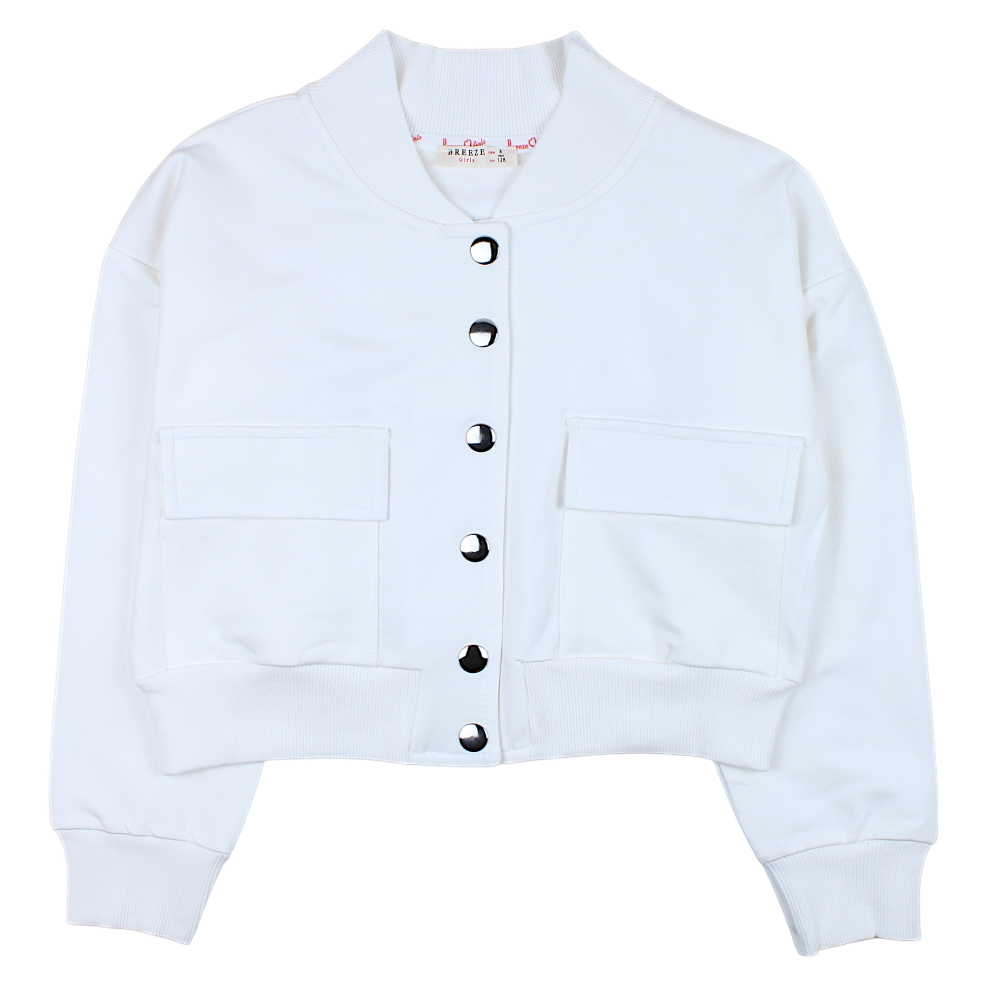A bomber jacket for girls by Breeze in a subtle cream color, perfect for the spring-summer season. Made of soft fabric, it has a **snap fastening** at the front. Two large **flap pockets** at the front add functionality and style. Finished in a ribbed style at the cuffs and at the bottom, it guarantees comfort of wearing. Perfect for everyday styling for little girls. Composition: 90% cotton, 10% elastaneSKU: 19884-2425-28