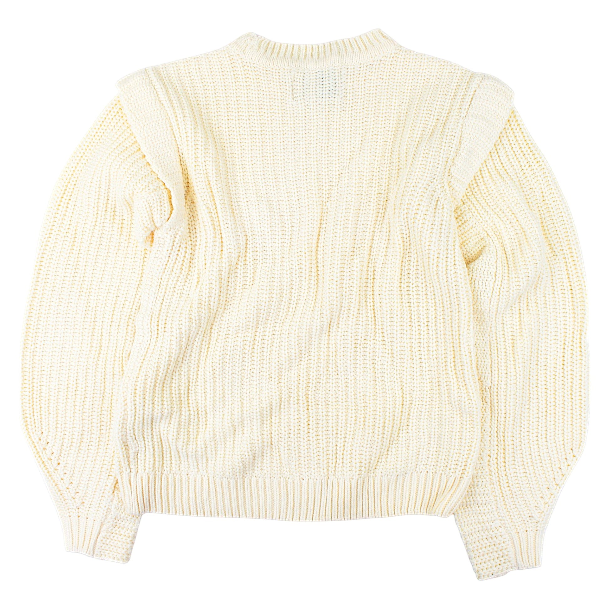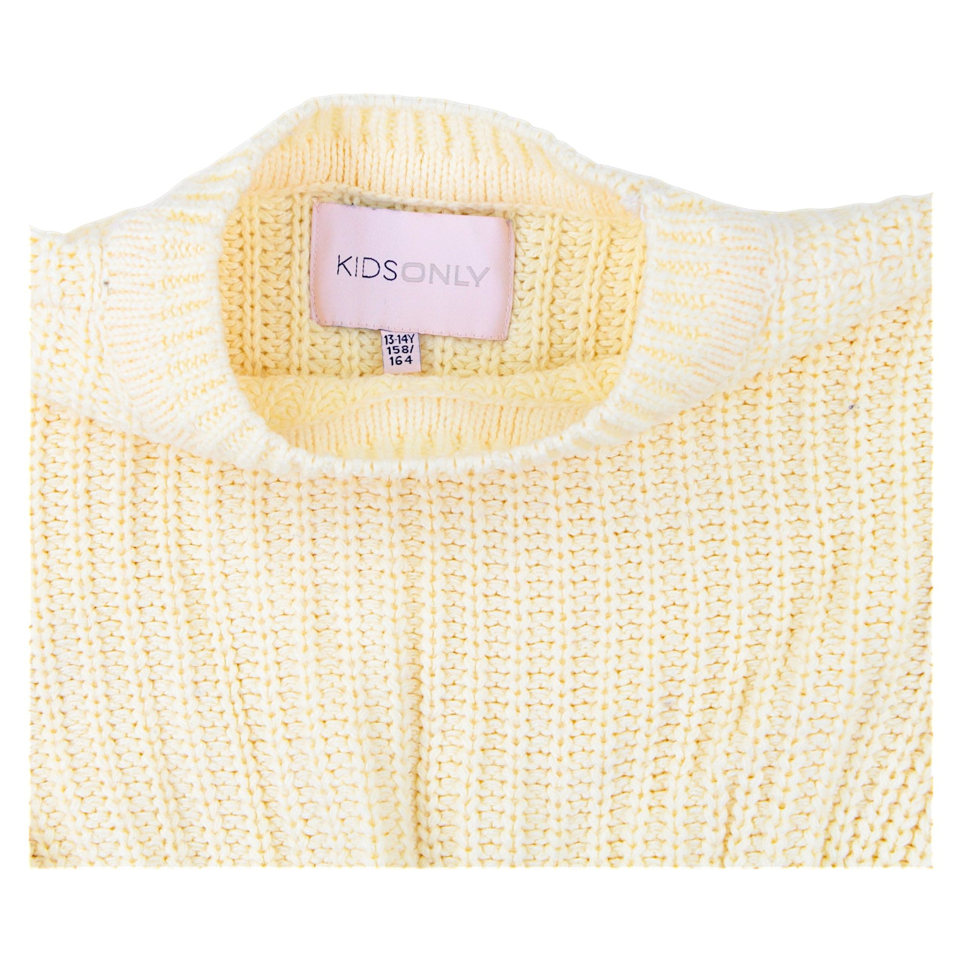 Stylish girls' sweatshirt worn over the head by KIDS ONLY in a delicate yellow color . Made of thicker, woven material with a ribbed weave structure, providing comfort and warmth. Long sleeves and a classic, round neckline add elegance and comfort. Perfect for the spring-summer season for everyday styling and special occasions.