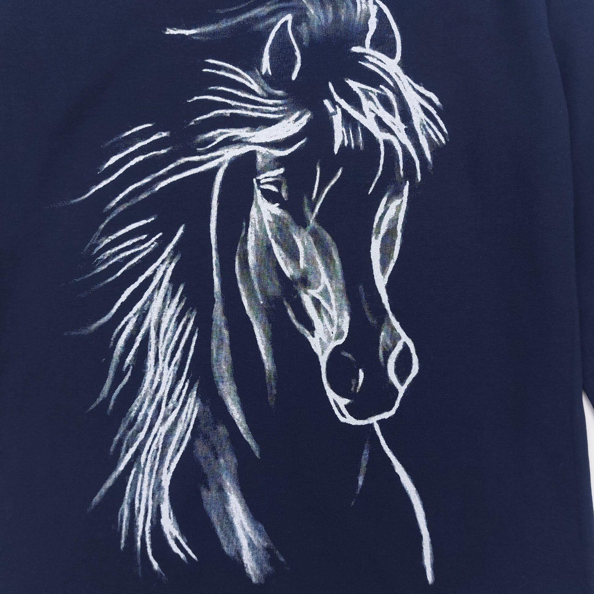 This navy blue children's blouse with a horse motif is the perfect choice for little animal lovers. The long-sleeved blouse for girls made of soft cotton provides comfort all day long. The graphic of a horse in dynamic movement gives it a unique character, emphasizing individual style. The delicate finish of the neckline and elastic material make the blouse perfectly fit the child's figure, not restricting movement during play. The product is great for both everyday and special occasions.