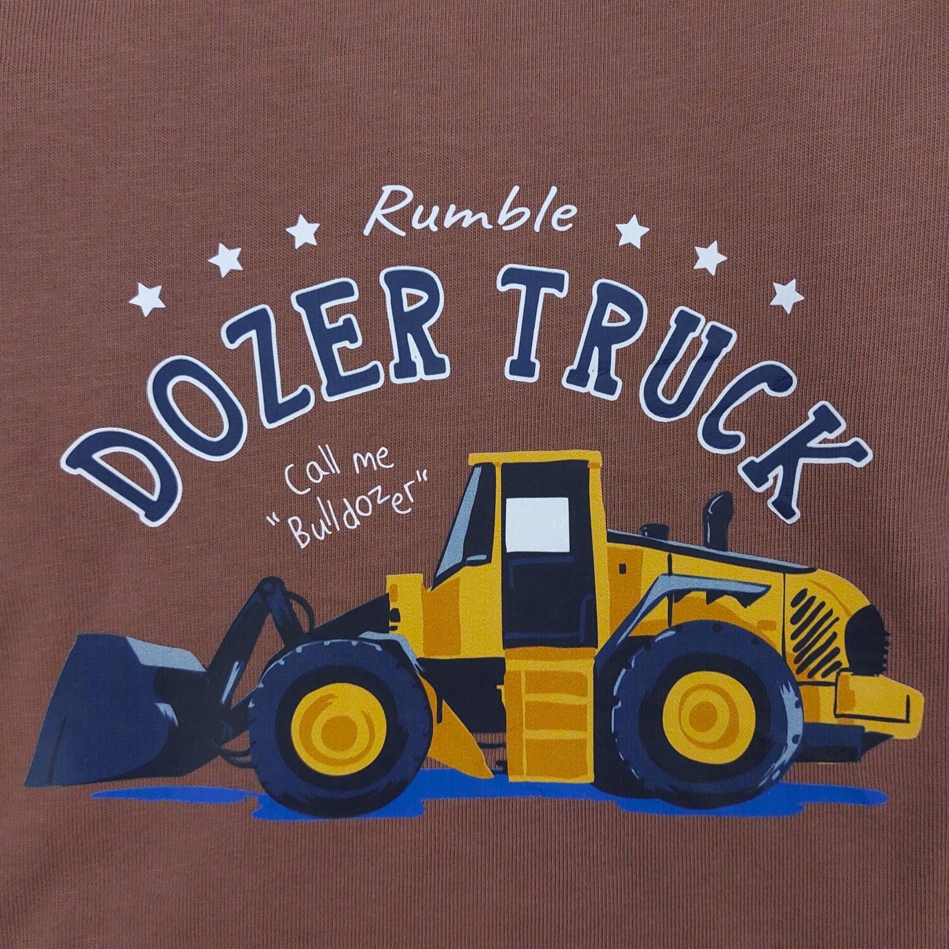 Boys cotton blouse with "Dozer Truck" excavator motif from Your Word (model 864-30924), perfect for colder autumn and winter days. Made in a shade of brown, with a large excavator print in bright yellow on the front and the inscriptions "Rumble" and "Call me Bulldozer". It has long sleeves and elastic cuffs.