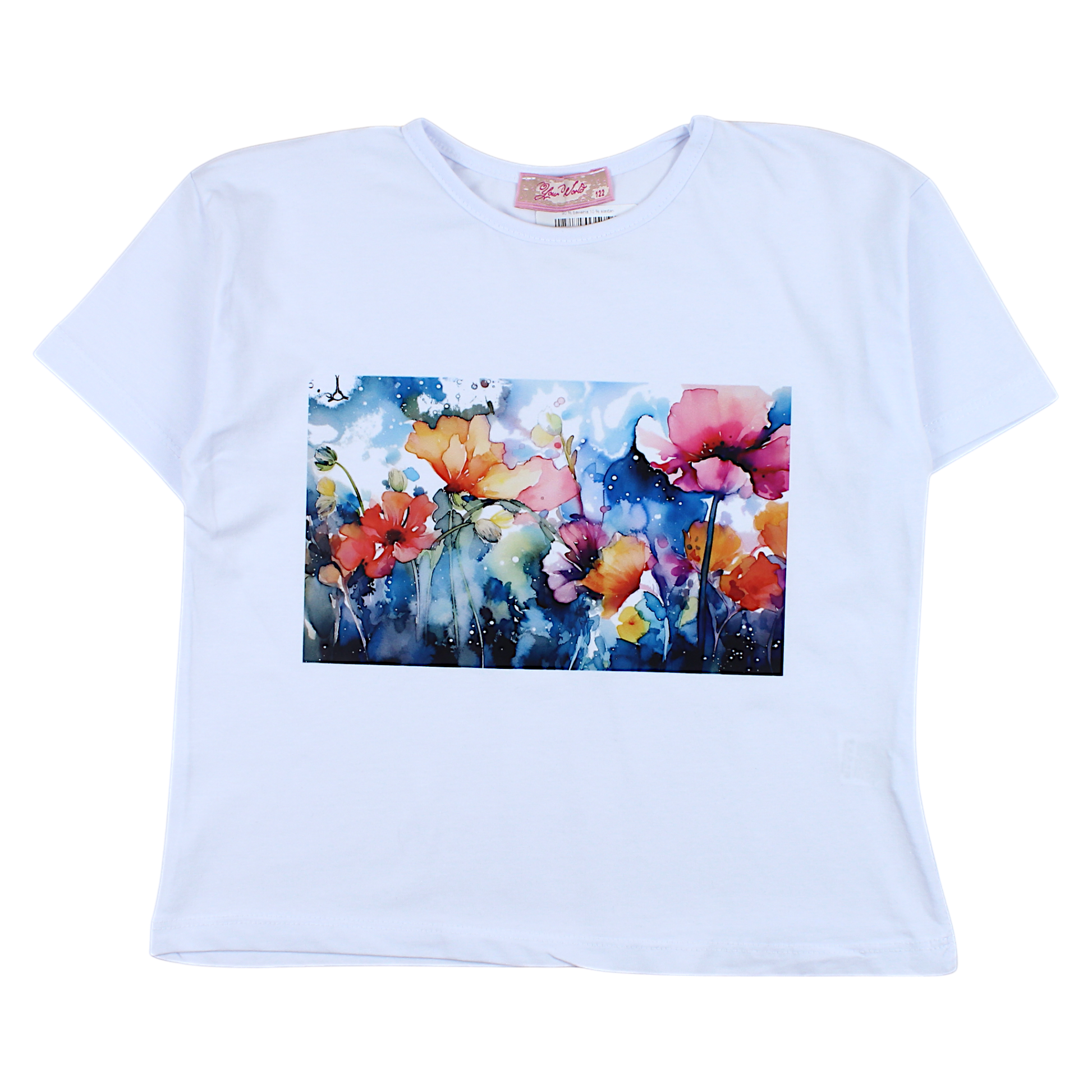 Girls' white blouse with a floral print , perfect for young fashion lovers. Made of pleasant to the touch material, it provides comfort when worn. Oversize cut with short sleeves makes it a great choice for warm days. No pockets, solid back. The print is colorful and eye-catching, giving the blouse a unique character. The product has no fasteners, which makes it easy to put on. Perfect for spring and summer.