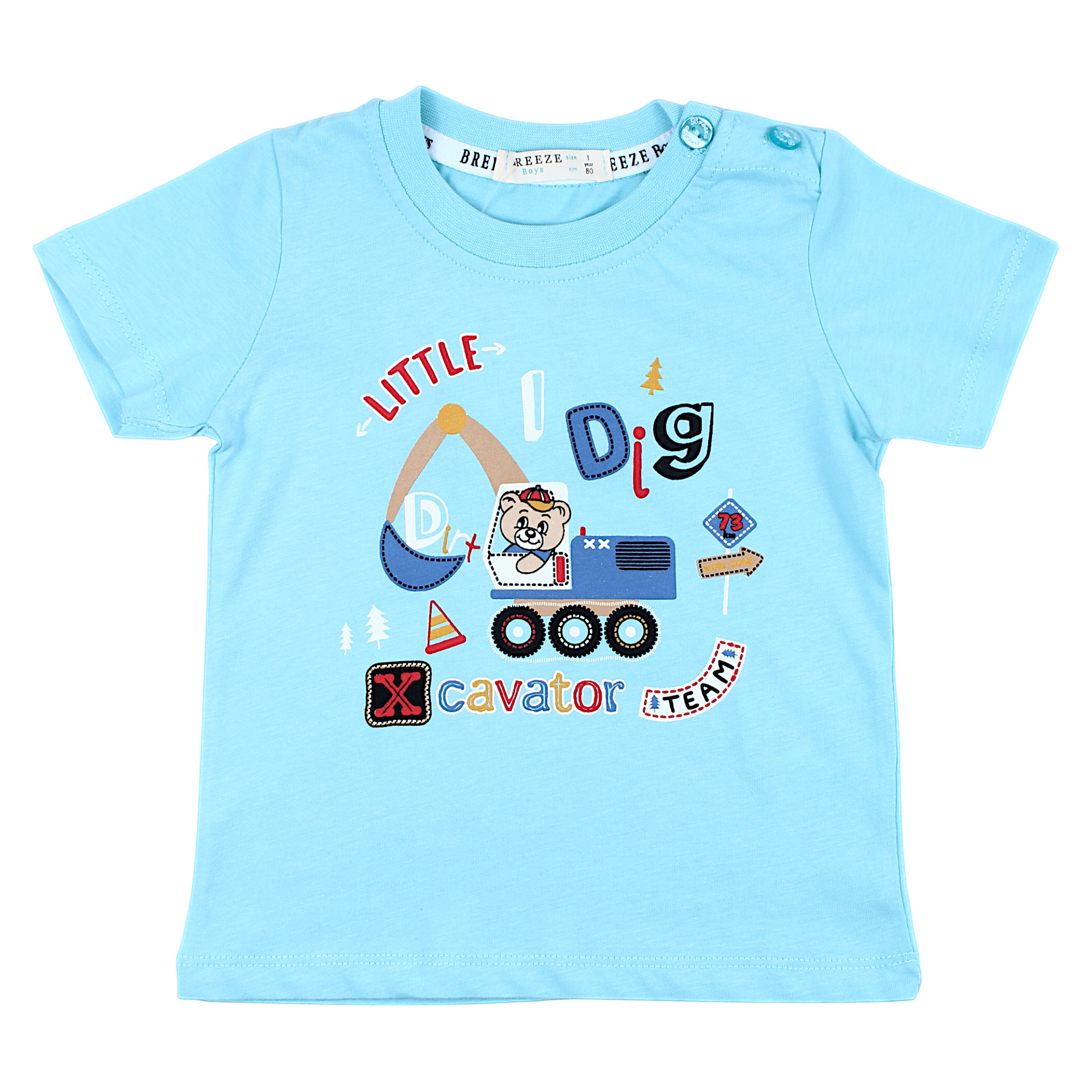 Turquoise blouse for boys with a cute excavator motif and a cheerful bear . It has comfortable, short sleeves and a button closure at the shoulder. Perfect for spring and summer days, made of soft and pleasant to the touch cotton.