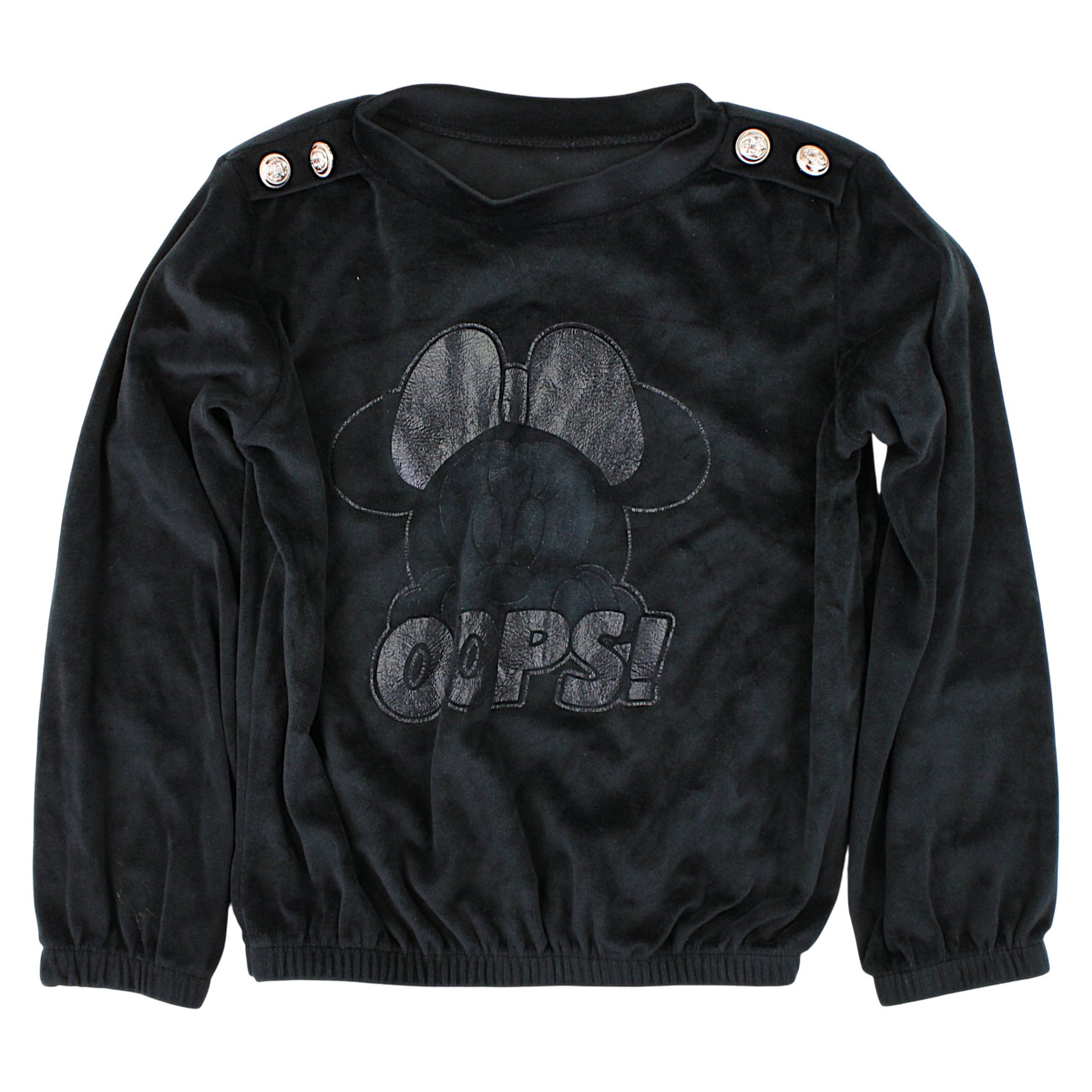 Stylish long-sleeved blouse for girls with a Minnie Mouse motif and the inscription "Oops!". Made of soft black velour , which gives it an elegant look. The blouse has decorative buttons on the shoulders , which add charm and originality. Elastic cuffs on the sleeves and at the bottom ensure a comfortable fit. Perfect for colder days, everyday or special occasions.