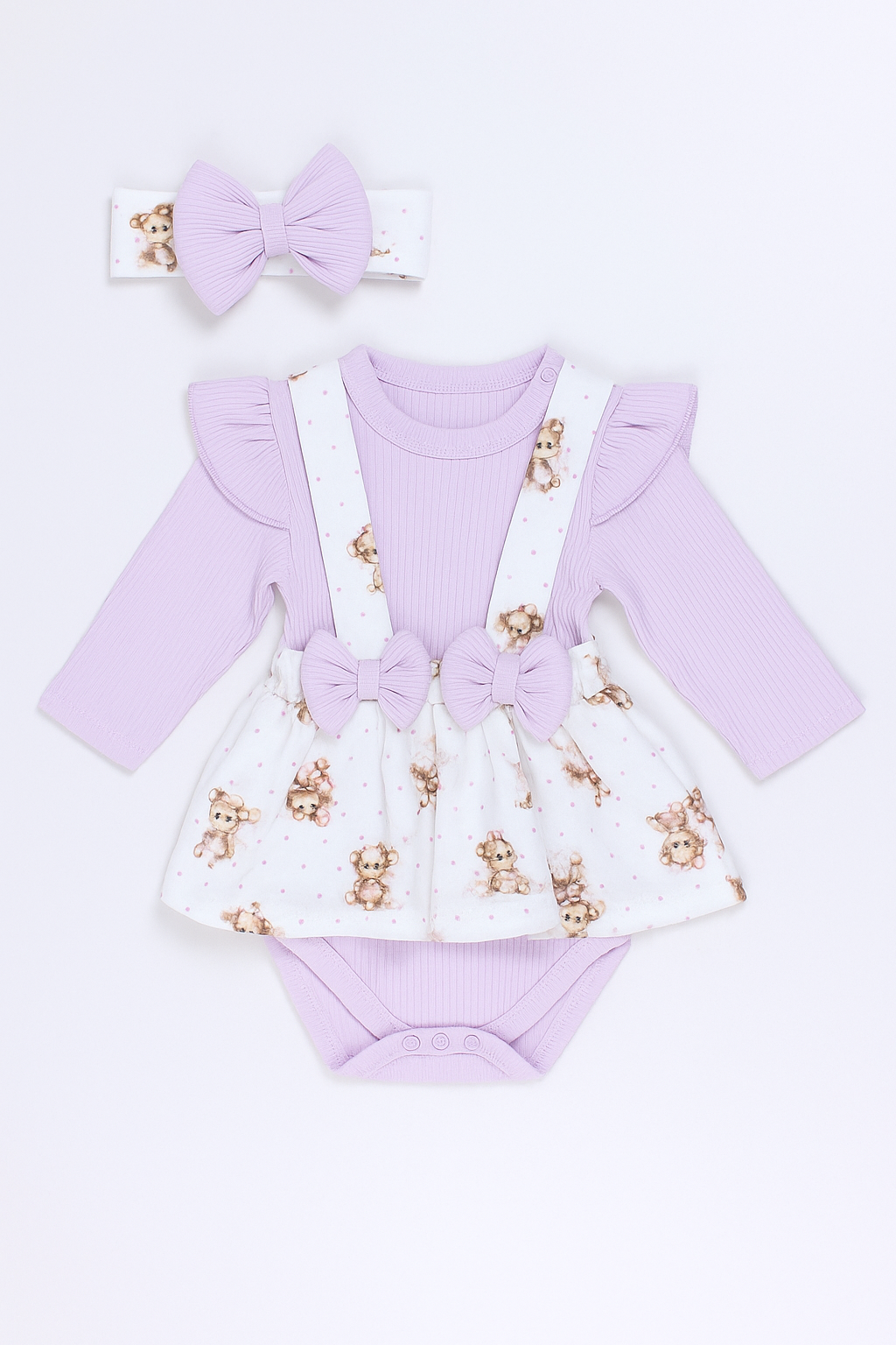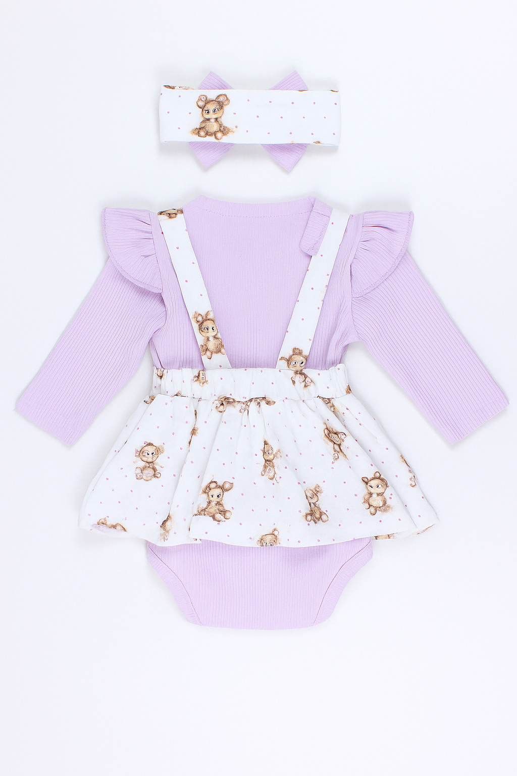 We present an elegant set for girls in a charming lilac color. The set consists of three pieces: a practical bodysuit , a stylish skirt with suspenders , and a charming headband . Made of exceptionally soft cotton , it ensures comfort while wearing. The bodysuit is designed with short sleeves and convenient snap closures on the shoulders and crotch for easy changing. The skirt has adjustable straps, allowing for a perfect fit to your child's height. All elements are crafted with attention to the smallest detail, making the set not only functional but also fashionable for any occasion. The perfect choice for spring and summer days.