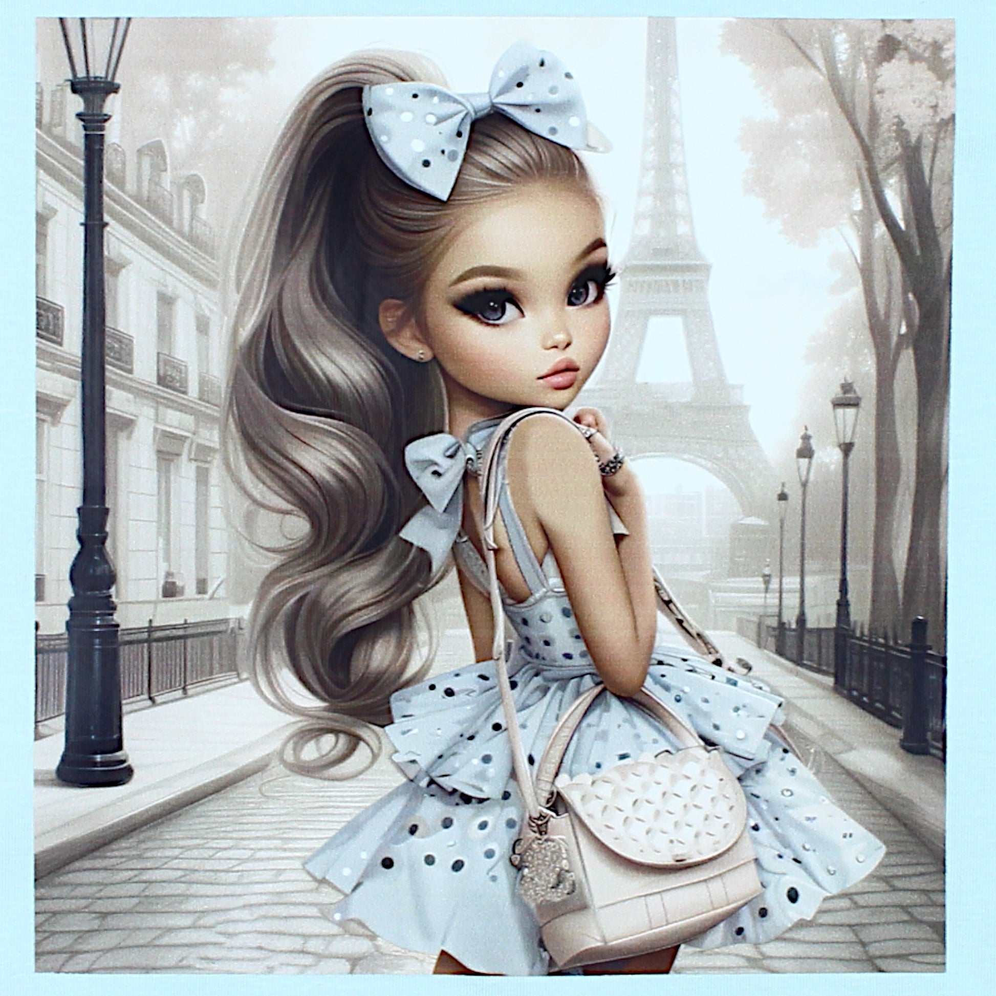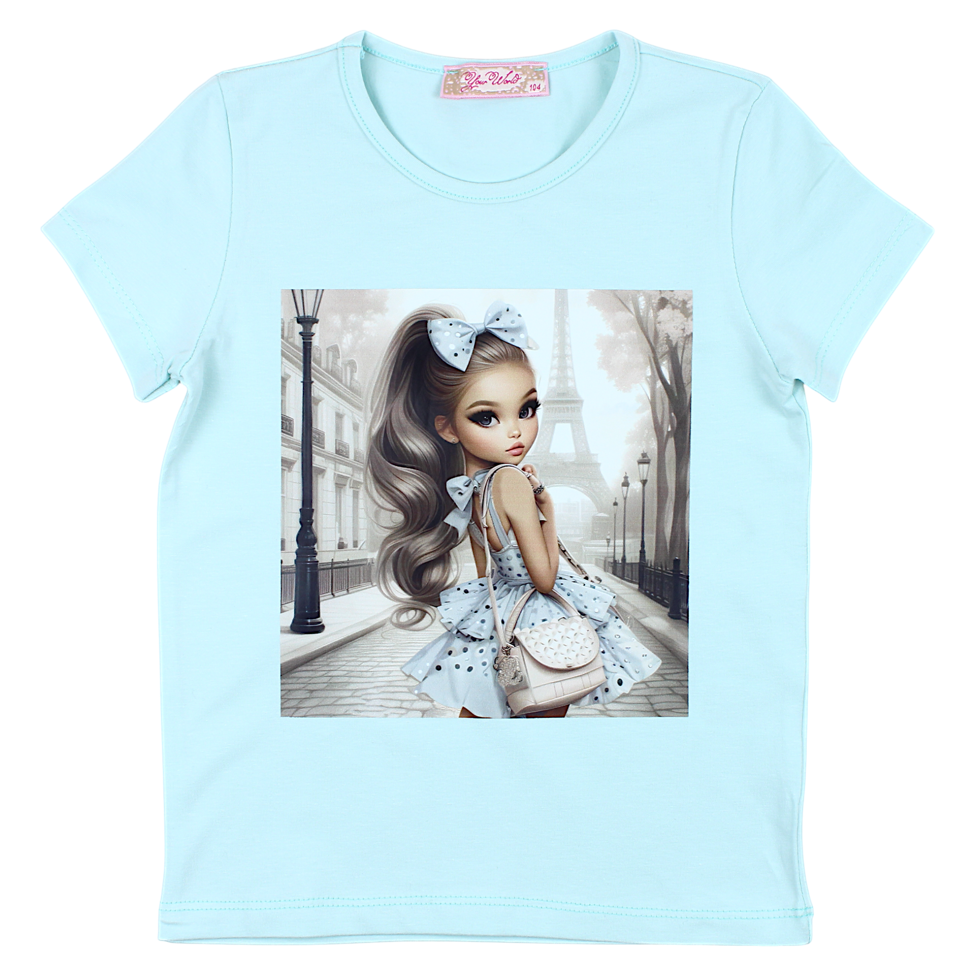 A mint-colored blouse for girls with short sleeves is a great choice for warmer days. On the front there is a charming graphic of a girl on a Parisian street with the Eiffel Tower in the background. The expressive print in the middle of the blouse adds a unique character. The finishes are delicately sewn, which ensures durability. The material is soft and flexible, which guarantees comfort of wearing every day. Ideal for wearing in the spring and summer season.