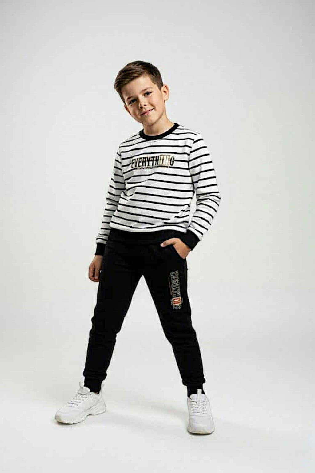 Dres bawełniany w paski dla chłopca marki Breeze to idealny wybór na sezon jesień-zima. Wykonany z miękkiej i przyjemnej w dotyku bawełny, zapewnia komfort noszenia przez cały dzień. Biały kolor dresu dodaje mu elegancji, a wzór w paski nadaje mu nowoczesnego wyglądu. Komplet składa się z bluzy i spodni, które posiadają elastyczne ściągacze, zapewniając wygodne dopasowanie. Bluza ma klasyczny okrągły dekolt i długie rękawy, a spodnie są wyposażone w praktyczne kieszenie. Idealny na codzienne aktywności i zabawy.Skład: 100% bawełna