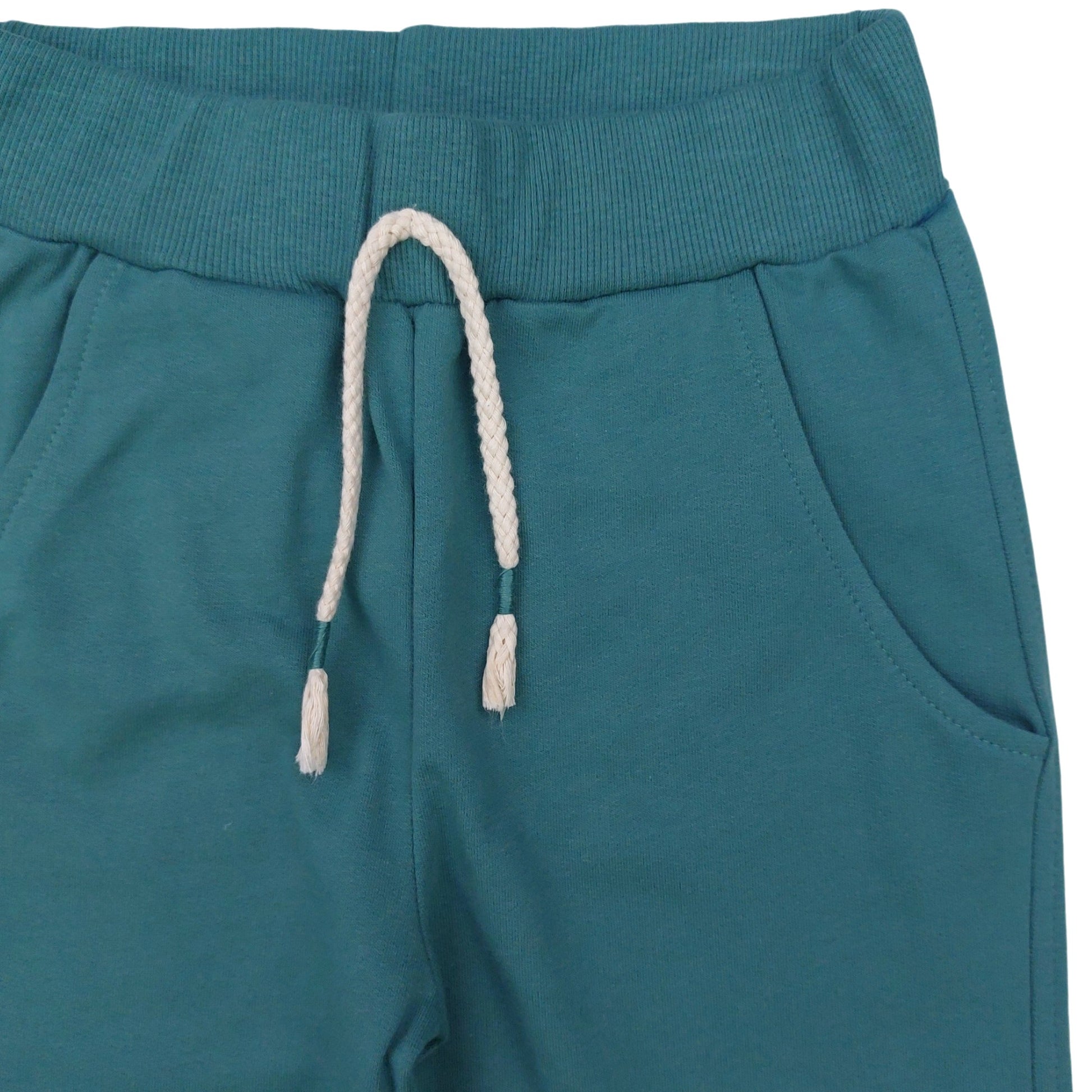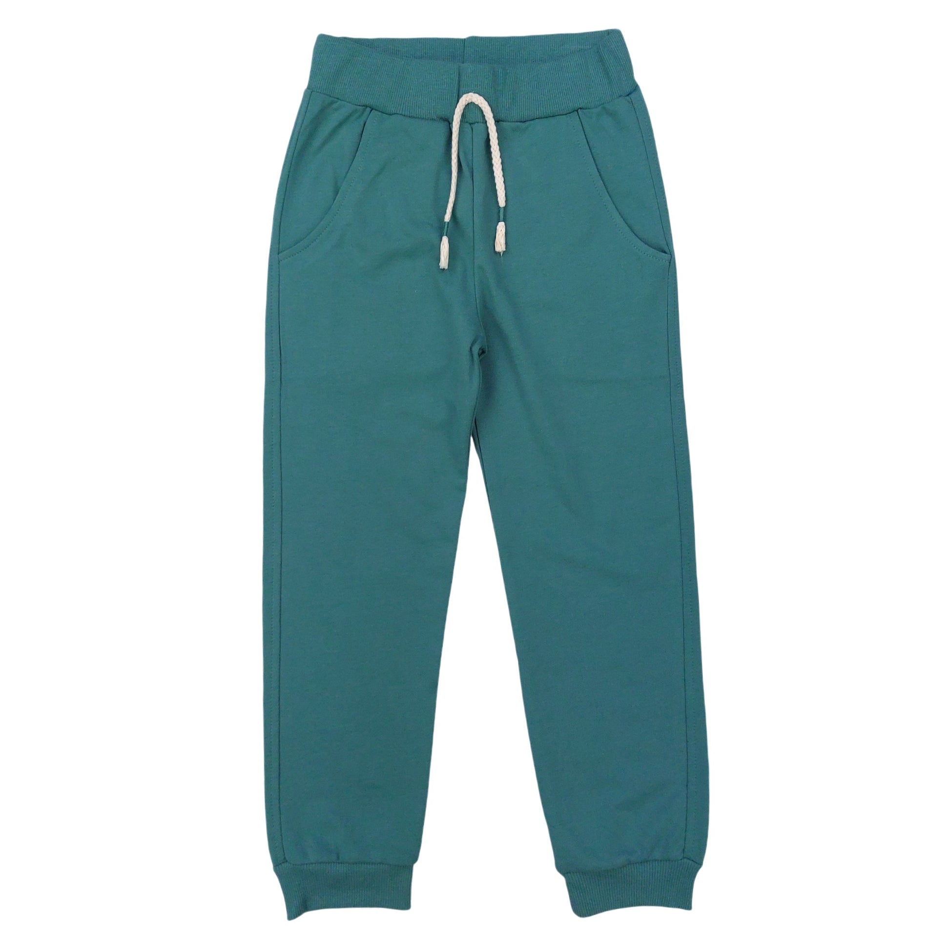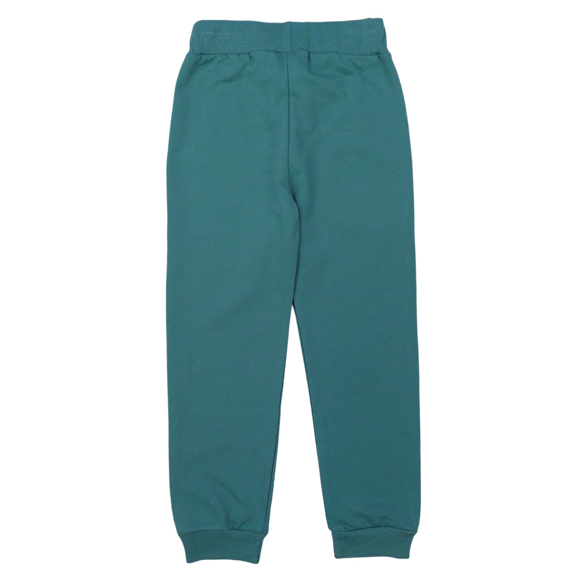 Trousers: Green tracksuit bottoms are the epitome of comfort. They feature practical pockets that can hold small treasures, and an elastic waistband with an adjustable drawstring, which allows for a perfect fit to the child's figure. The legs are finished with cuffs, so the trousers stay in place perfectly during play or running.