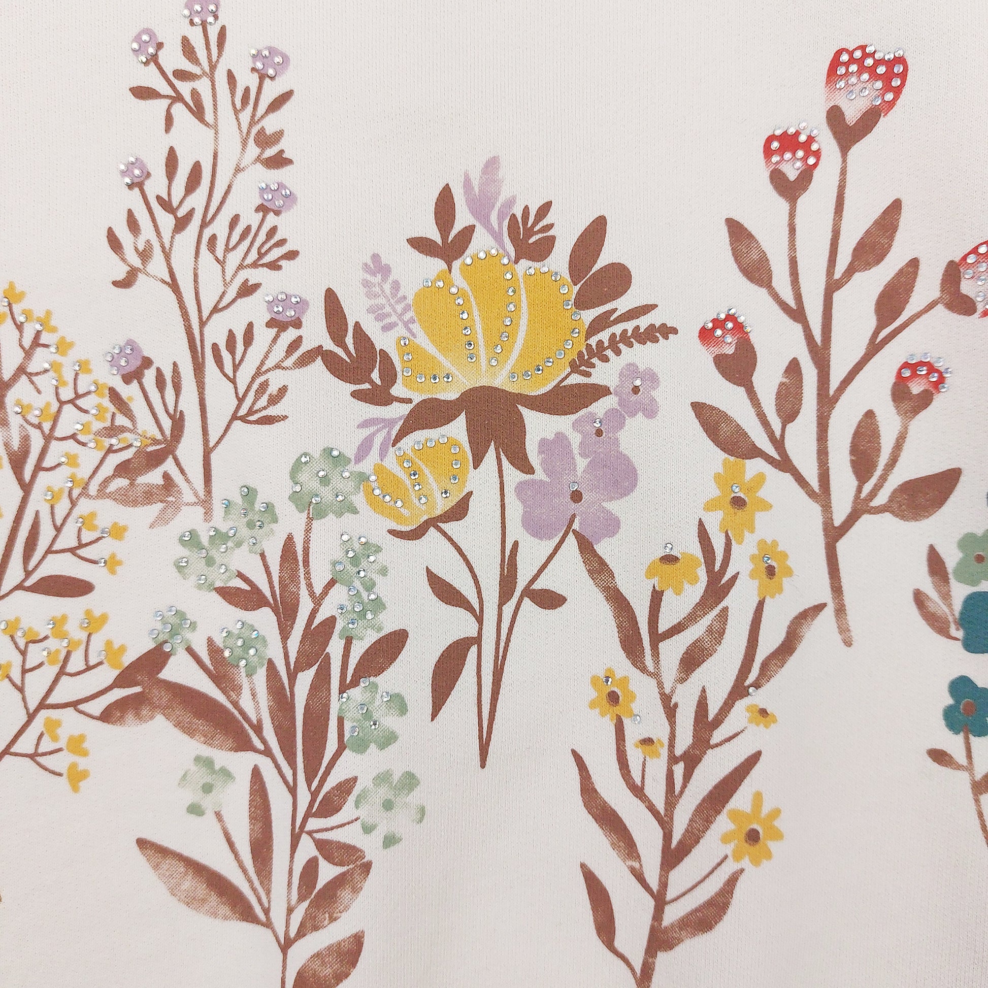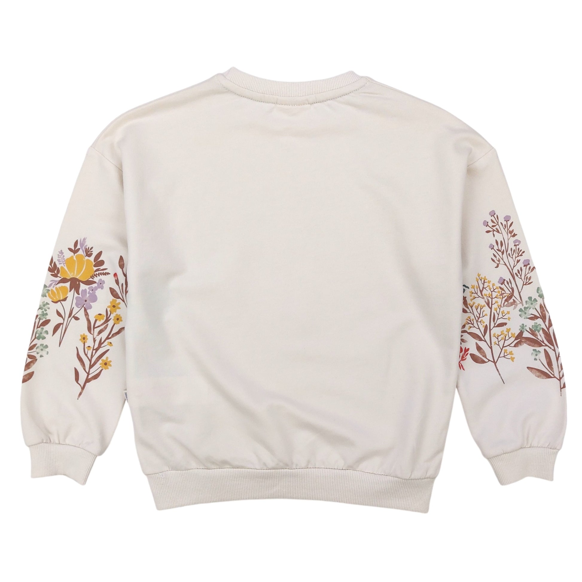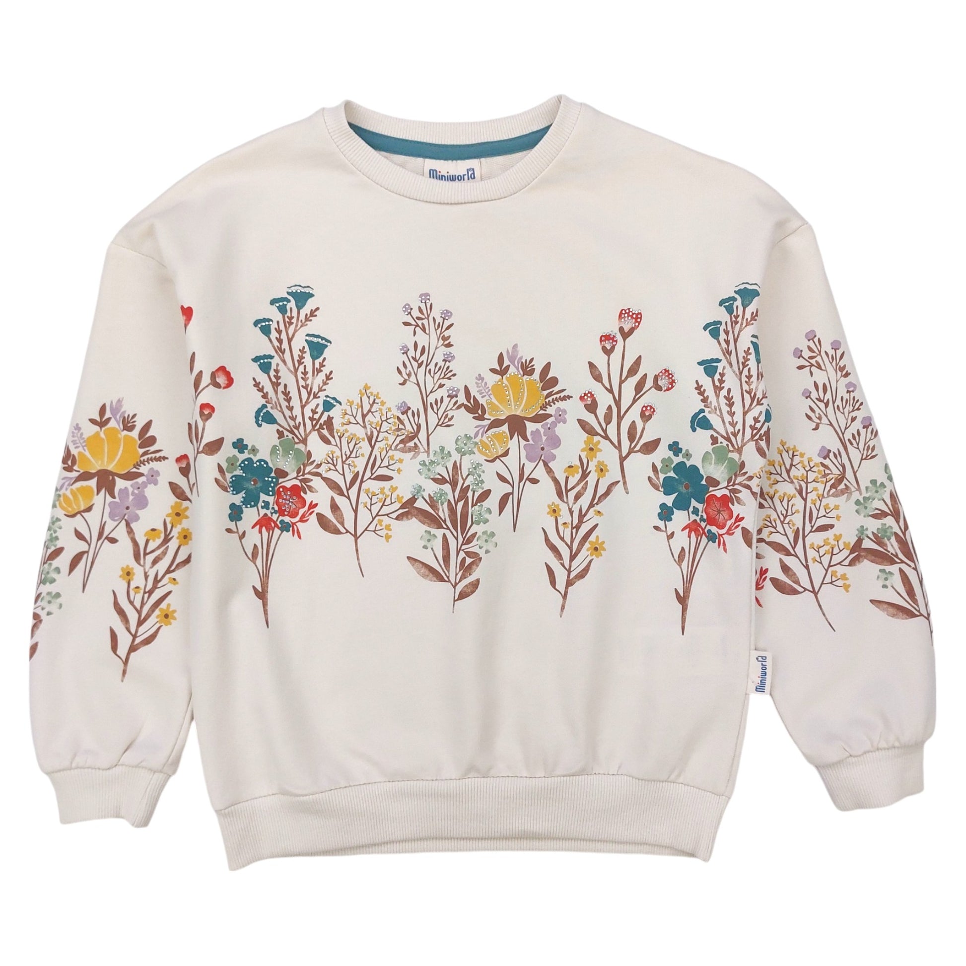 Sweatshirt: The beige sweatshirt with a loose cut captivates with a subtle print of flowers in vivid colors. The print attracts attention, giving the whole thing lightness and girlish charm. The elastic cuffs on the sleeves and bottom of the sweatshirt guarantee a good fit, while providing freedom of movement. This is a great choice for colder days when the child needs both warmth and a stylish look.
