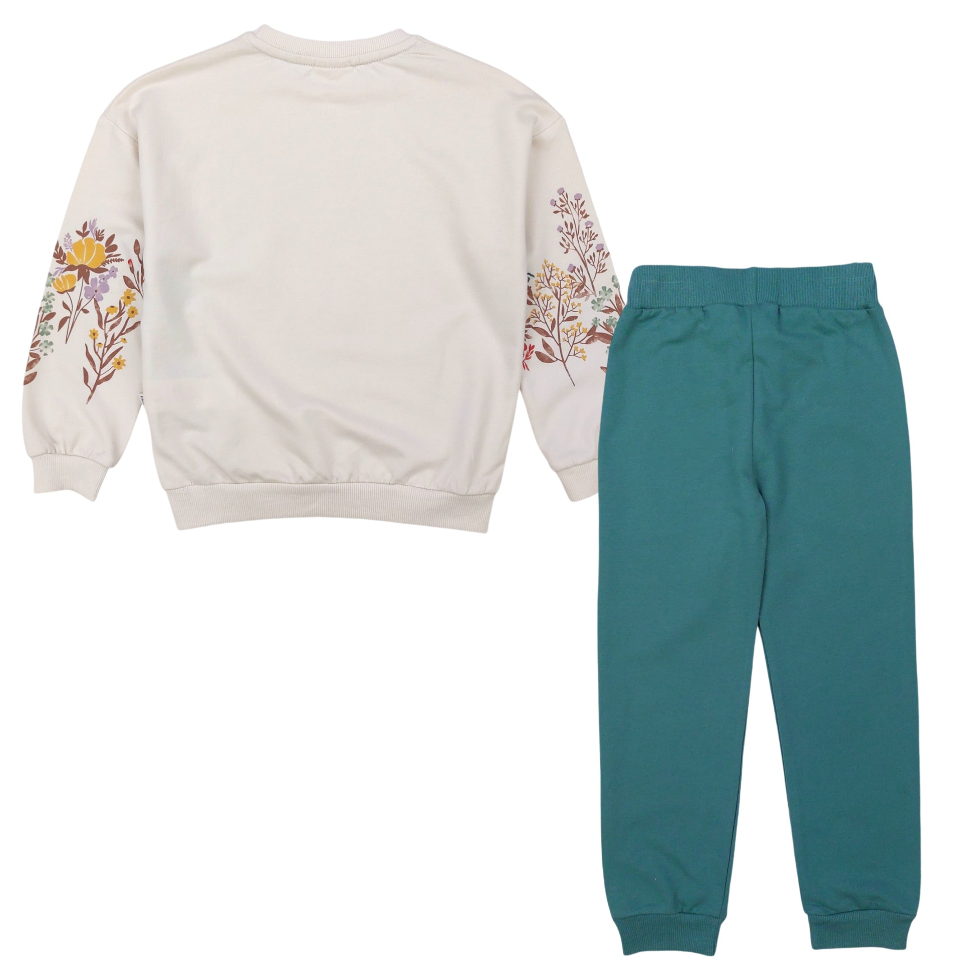 Discover an incredibly cute and practical tracksuit for girls , which is perfect for both everyday walks and special occasions. This set was designed with the comfort and style of the youngest in mind. It consists of two elements: a beige sweatshirt with a beautiful floral print and green tracksuit bottoms with an elastic waistband and a drawstring to adjust.