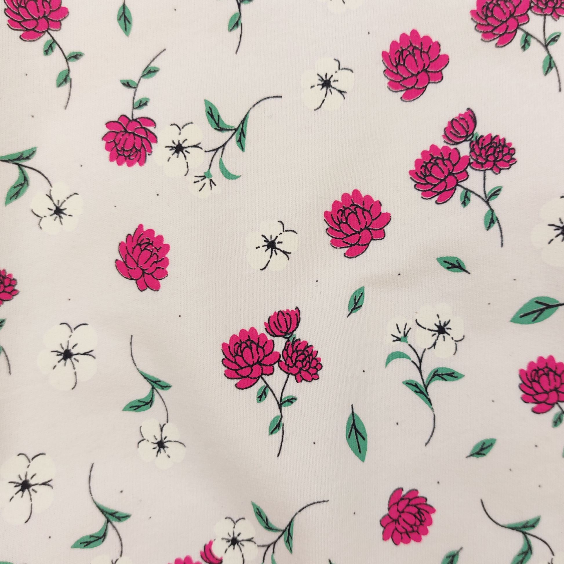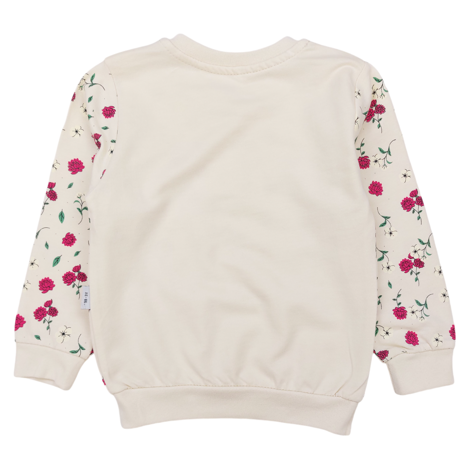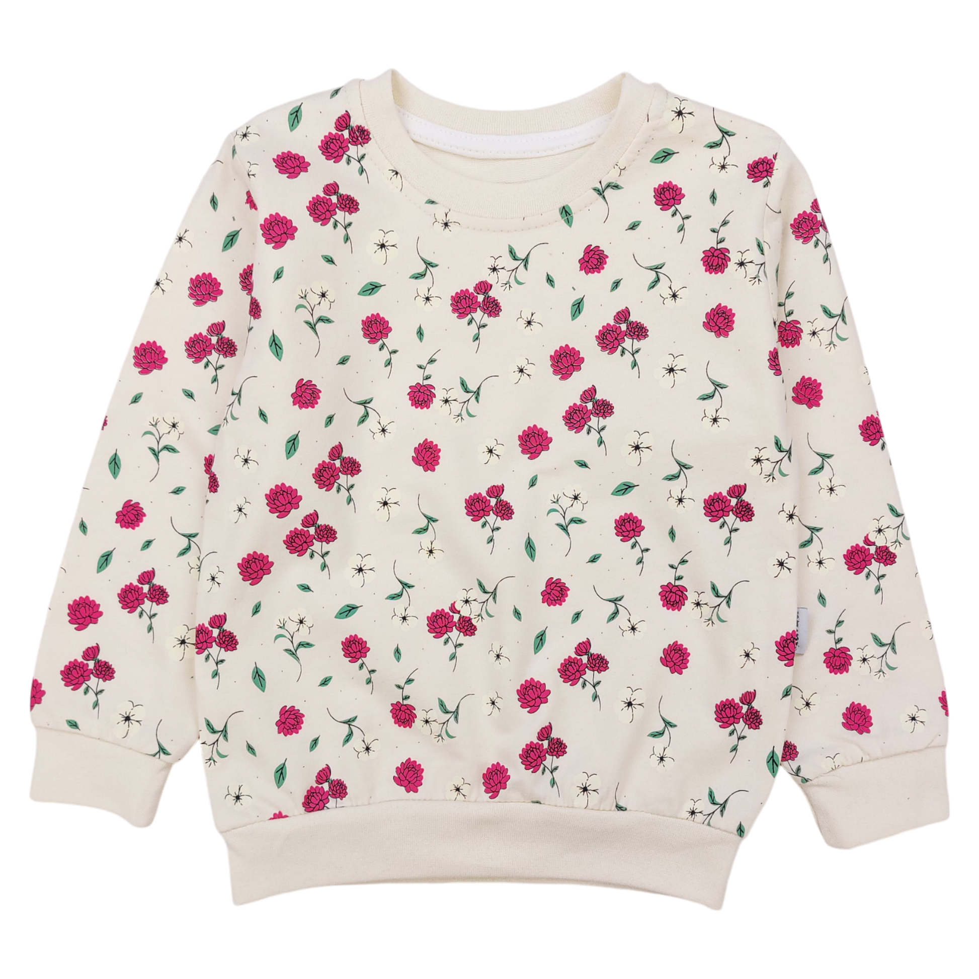 The top part of the set – the sweatshirt – attracts attention with its girlish design. It is decorated with a charming pattern of pink flowers, which add a unique charm to the whole. The subtle cream background makes the floral motif look delicate, yet very effective. The sweatshirt has elastic cuffs on the sleeves and at the bottom, which ensures a perfect fit and comfort, even during intense play.