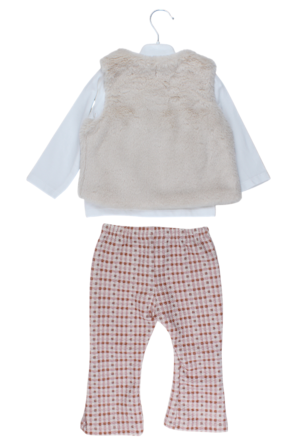 We present a charming 3-piece set for girls, perfect for the fall and winter season. The set consists of a beige vest with fur , a stylish blouse, and comfortable pants. The vest features soft fur for warmth and comfort. The blouse is made of a soft-touch material, and the pants have an elastic waistband for freedom of movement. The entire set is finished in an elegant beige color, making this set a perfect choice for colder days.