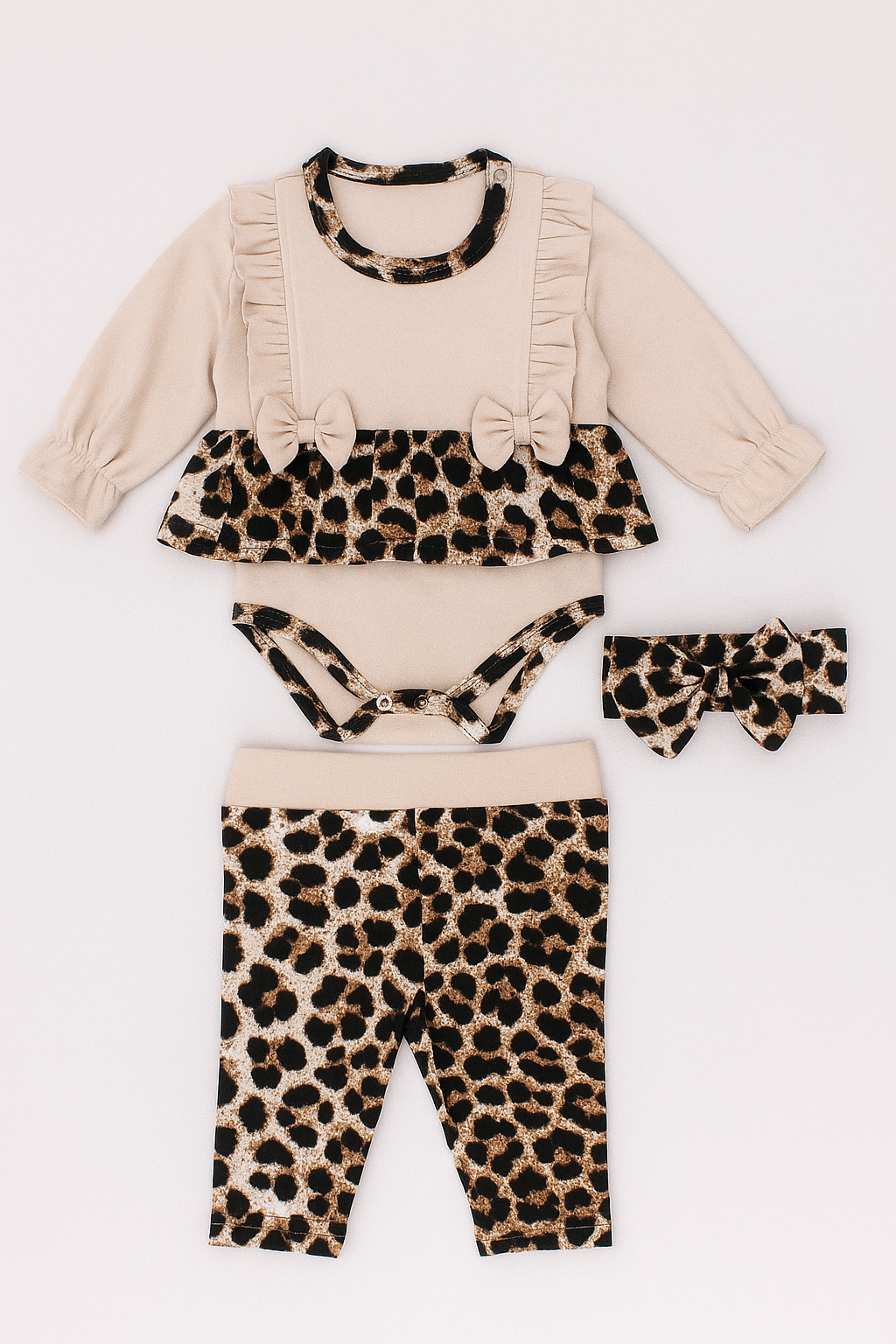 A charming girly set consisting of a beige bodysuit, headband , and shorts . The perfect choice for the spring and summer season. The bodysuit is made of soft, delicate fabric, ensuring comfort against baby's skin. The headband subtly complements the look, adding a girly touch. The shorts have an elastic waistband, ensuring a perfect fit.