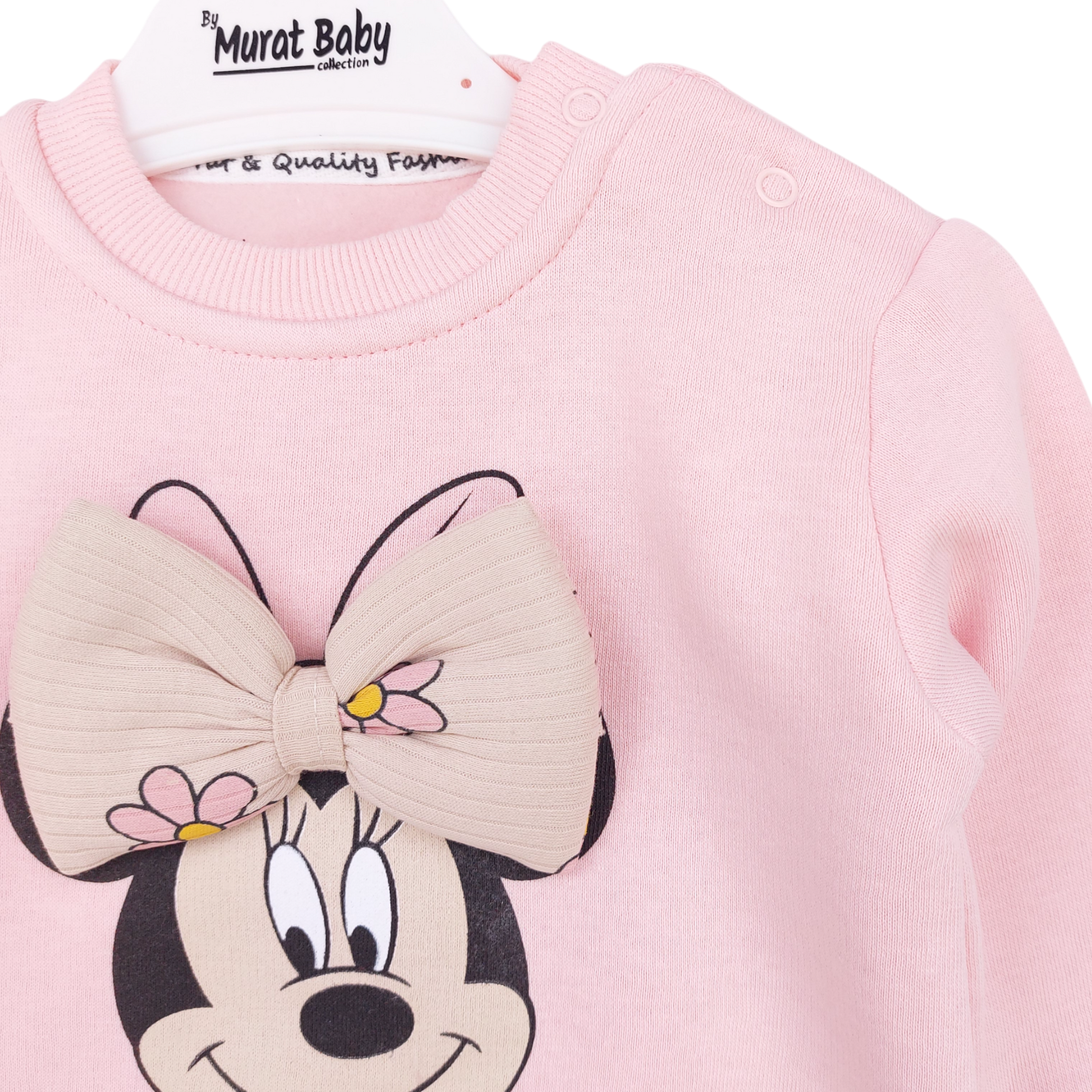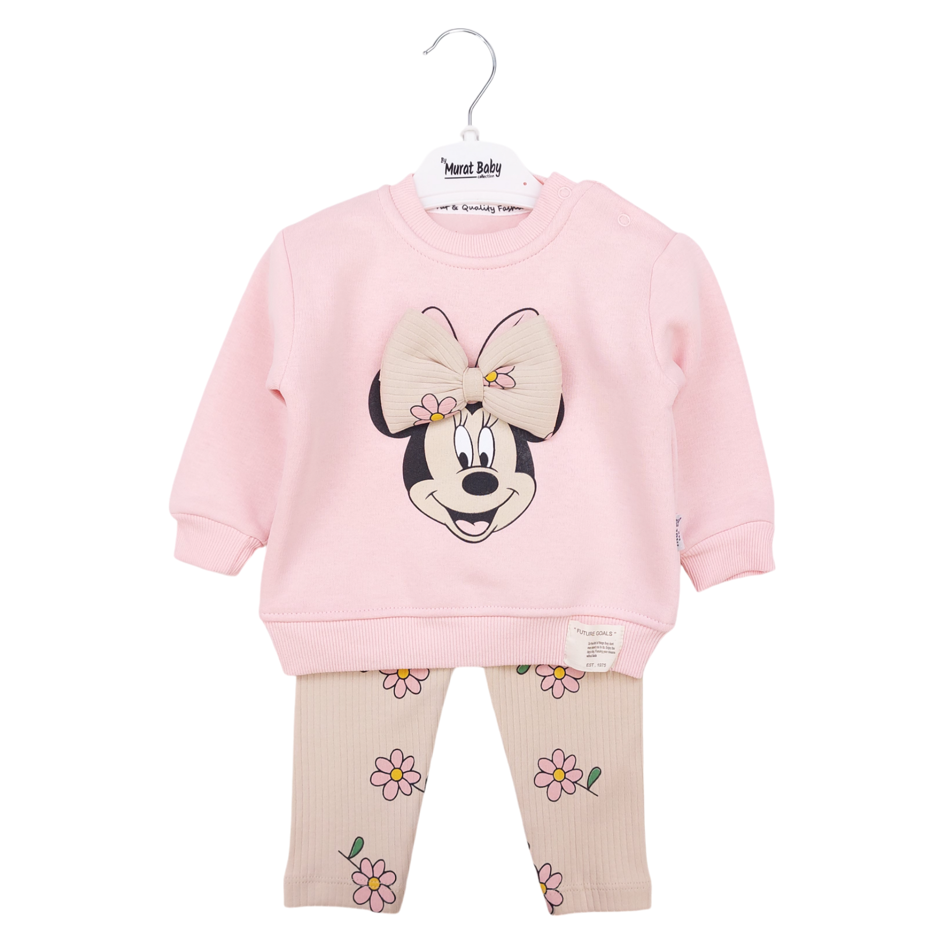 A lovely children's set for girls with a character motif. This pink outfit consists of a soft printed blouse with a decorative 3D bow. The bottom consists of floral patterned trousers, which create a great contrast to the girls' horns, elegant style fits and stylish.