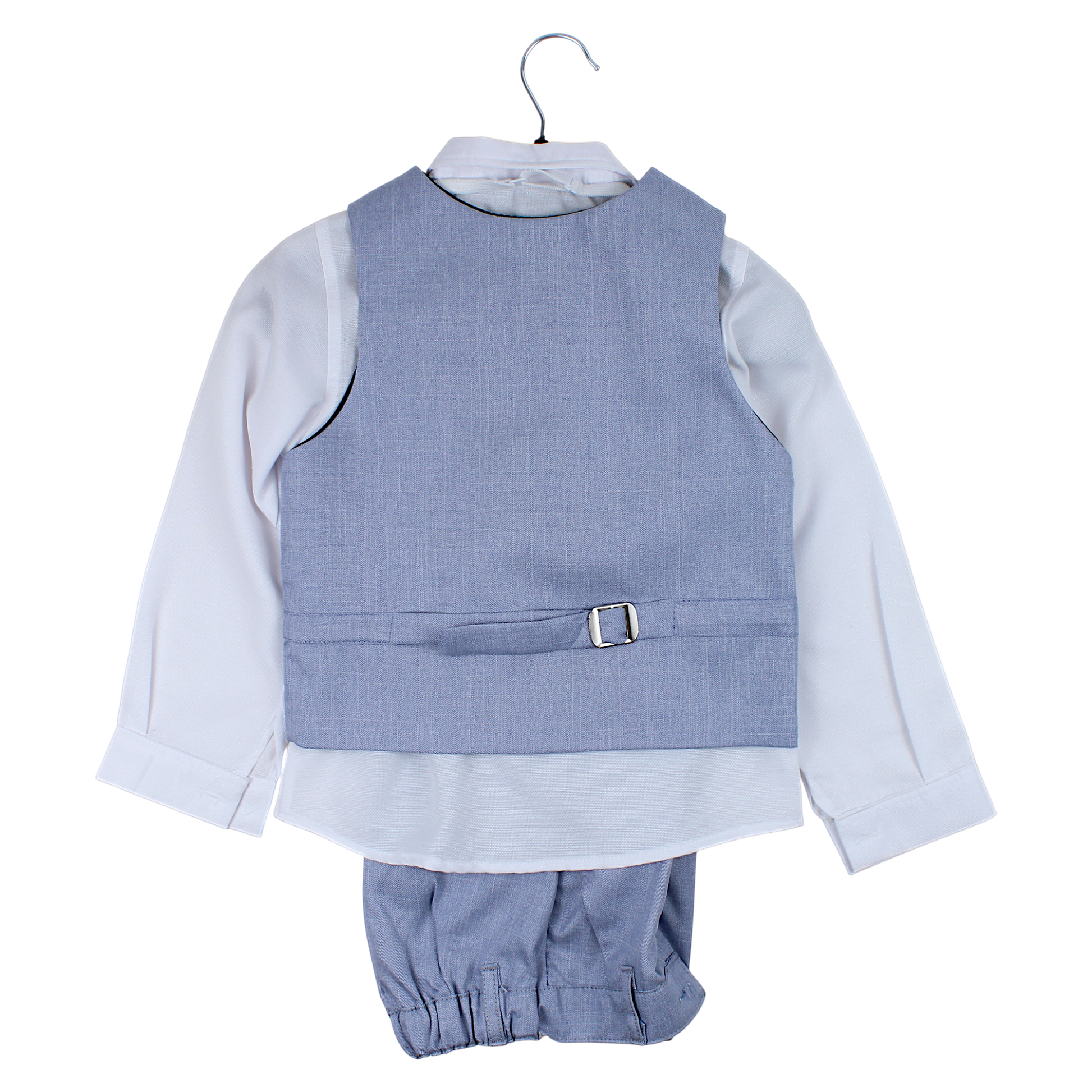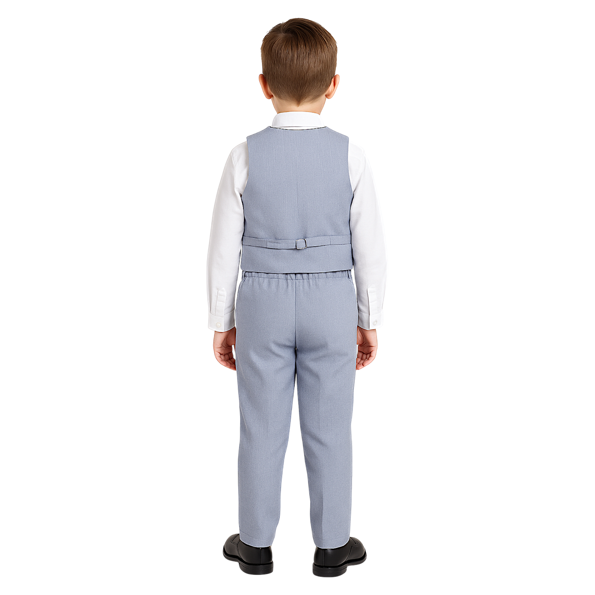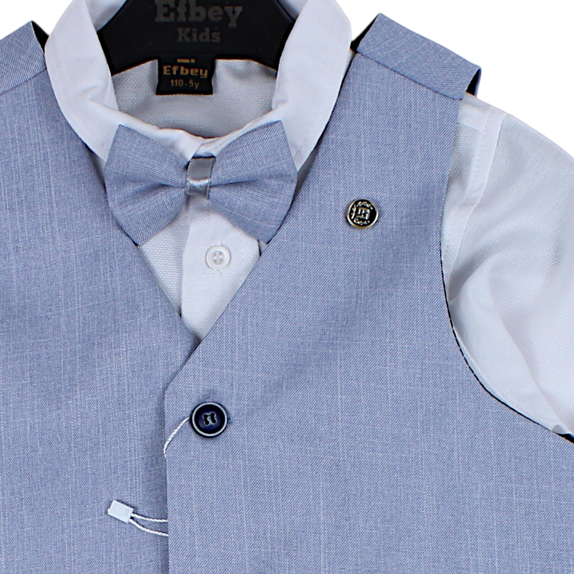 We present an elegant blue boys' suit , perfect for special occasions in the spring/summer season. The set consists of four complementary pieces. It includes an elegant long-sleeved shirt with button-front closure. The vest and trousers add charm and stand out with their classic, clean design. A tasteful bow tie completes the look, lending a sophisticated touch. The set is crafted with attention to detail, ensuring comfort and durability. A perfect choice for little gentlemen.