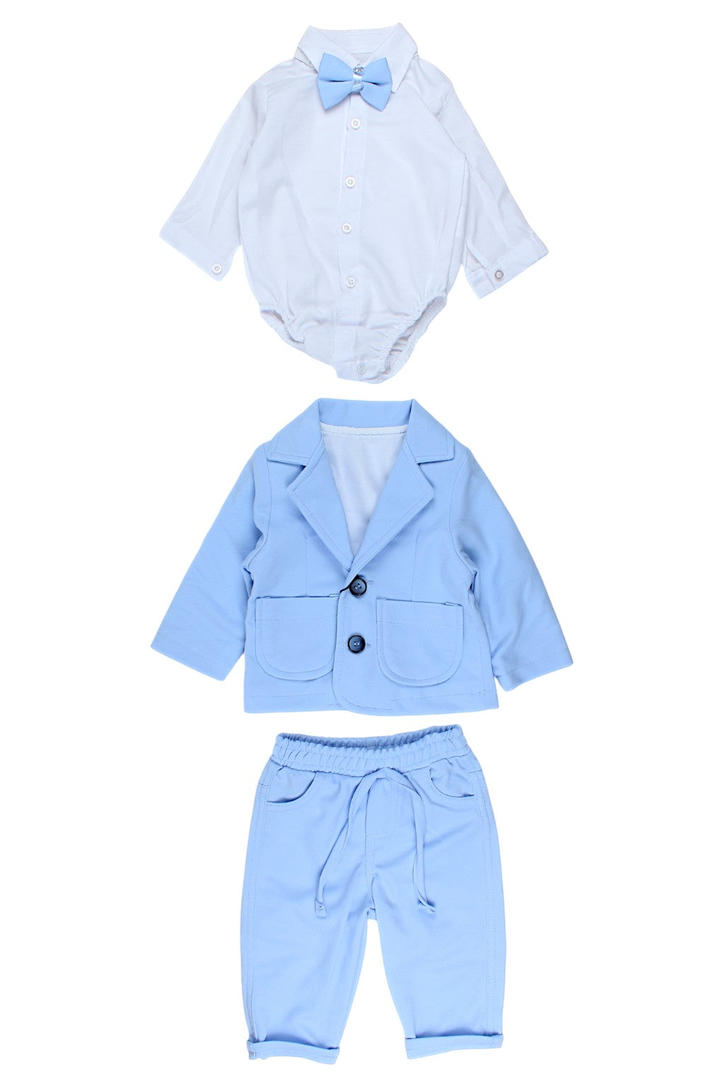 We present an elegant blue boys' set from Emiclass . It consists of four pieces: a shirt-bodysuit with a bow tie, a jacket, and trousers (shoes not included). The shirt-bodysuit features an elegant bow tie for a chic touch. The jacket has a classic cut with pockets, and the trousers are comfortable and stylish. Perfect for special occasions, it provides comfort and elegance for every boy.