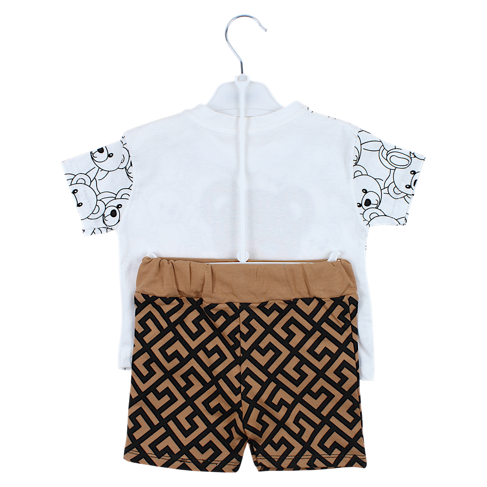 The presented Murat Baby boy set is the perfect solution for the upcoming spring-summer season . The whole is made in a delicate, beige color , which is an attractive basis for styling for boys . The top of the set is a T-shirt with short sleeves, on which there is a charming print of teddy bears . Such a motif wins the hearts of both children and parents. The shorts have comfortable elastic bands at the waist, which ensures fit and comfort of wearing. The materials used allow the skin to breathe, which is extremely important, especially on warmer days. The back of the set is uniform, without additional applications, which adds elegance and simplicity. The product is intended for preschool children , perfect both for everyday use and for special occasions.
