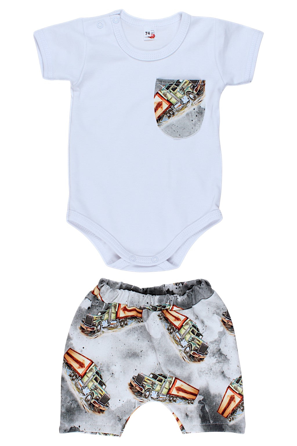 We present the TIR bodysuit set for boys by Guliwerkids , perfect for children in the spring/summer season. This charming set is made of high-quality materials that guarantee both comfort and durability. The gray color provides a perfect base that can be easily matched with other items in the wardrobe. The bodysuit features a stylish short-sleeved design, ensuring your child feels comfortable in it even on warmer days.
