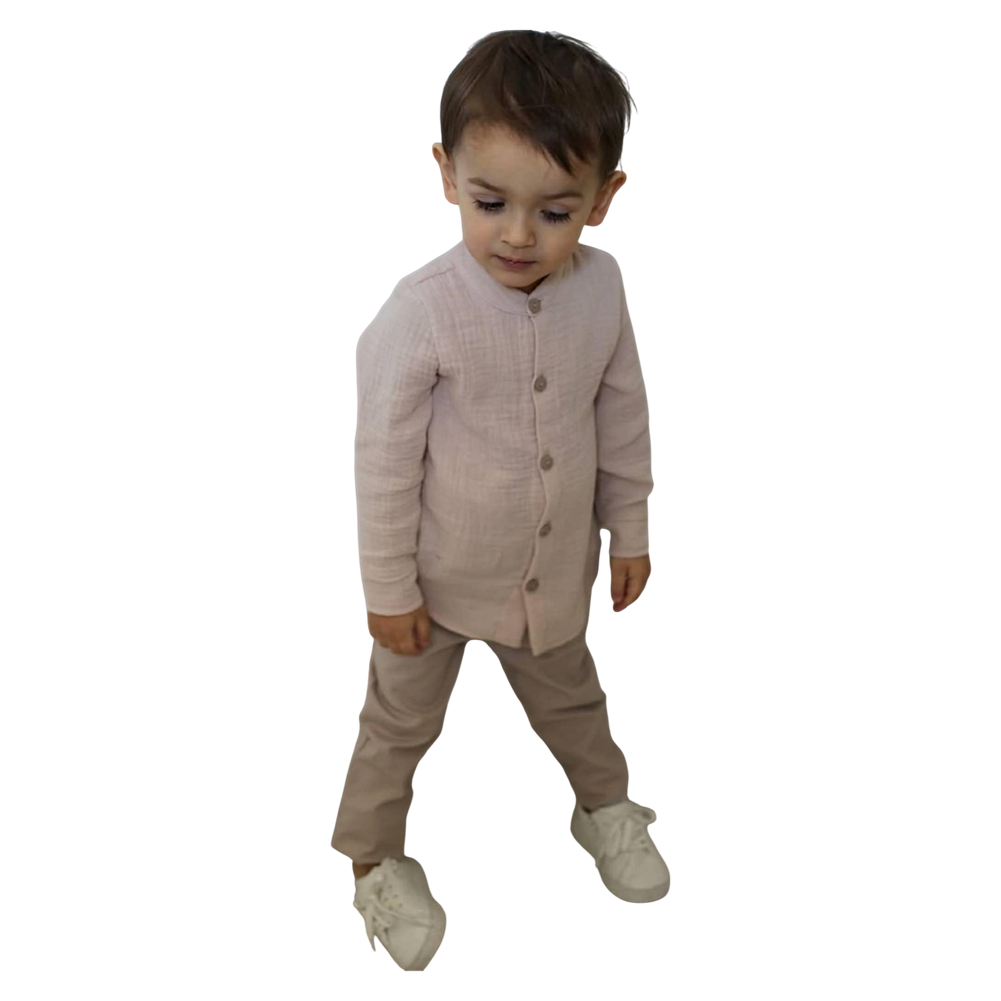 Elegant beige muslin shirt for a boy, designed by Royal Kids . Made of soft and airy material, perfect for spring-summer . It has a stand-up collar , which adds a chic look. The shirt is fastened with buttons , which makes it easy to put on and take off. It has no pockets, which gives it a simple and elegant look, perfect for special occasions.