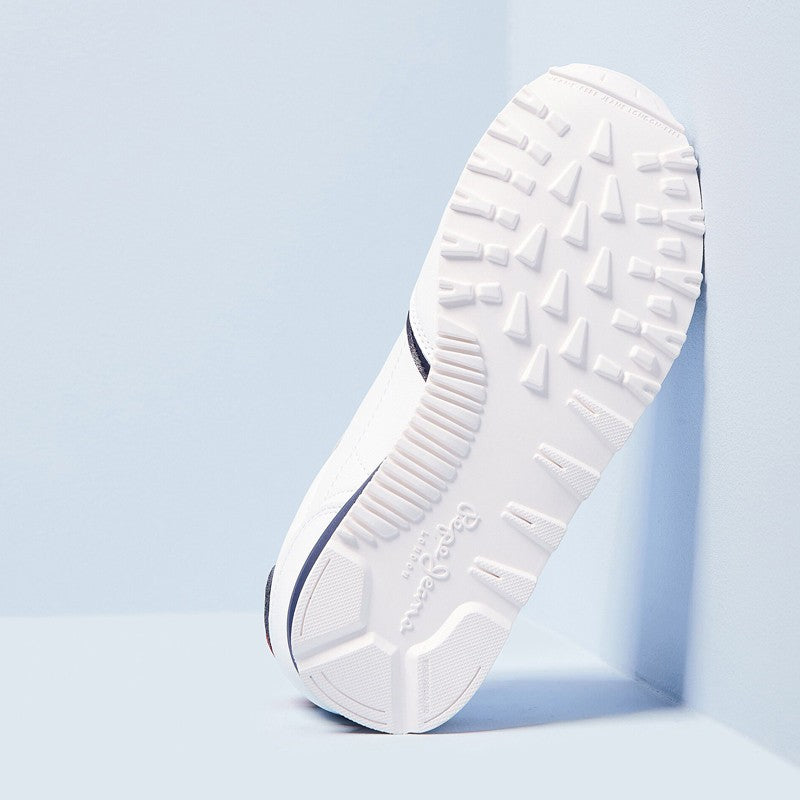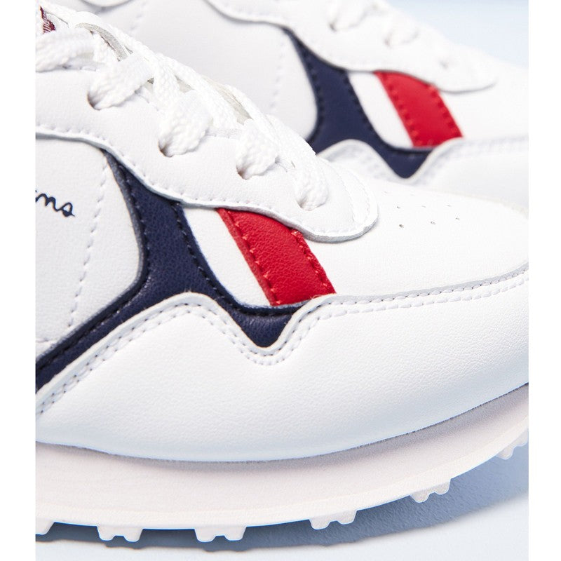 Snow-white colors combined with navy blue and red accents give these sneakers a unique character. The upper made of high-quality synthetic material ensures durability and ease of keeping them clean, which is especially important in the case of children's shoes. The subtle Pepe Jeans brand logo placed on the side and on the heel emphasizes their reputation and high quality.