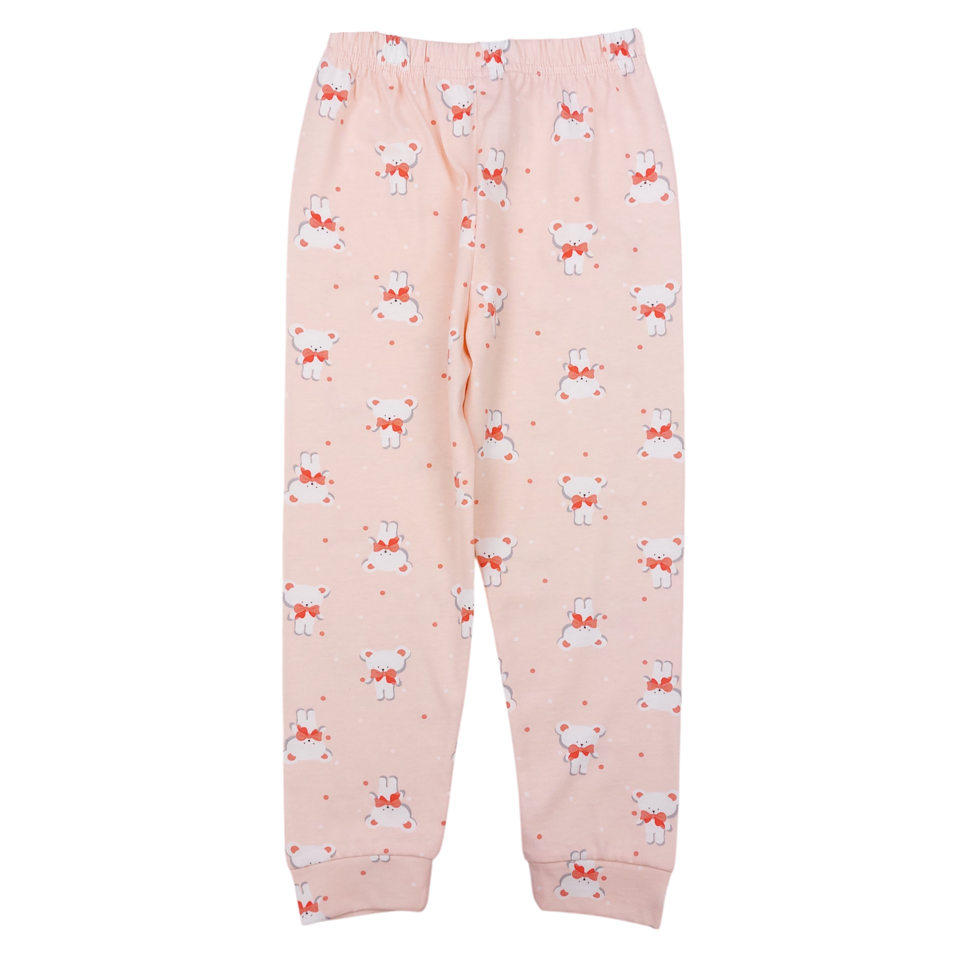 Adorable girls' pajamas in a shade of apricot , consisting of long sleeves and long pants. The top of the pajama is decorated with a print of a teddy bear holding a heart and small red hearts and the inscription "Hello Love". The pants are decorated with a pattern with a teddy bear motif, creating a coherent and sweet set. Comfortable cut without pockets and fasteners ensures freedom and comfort when worn.
