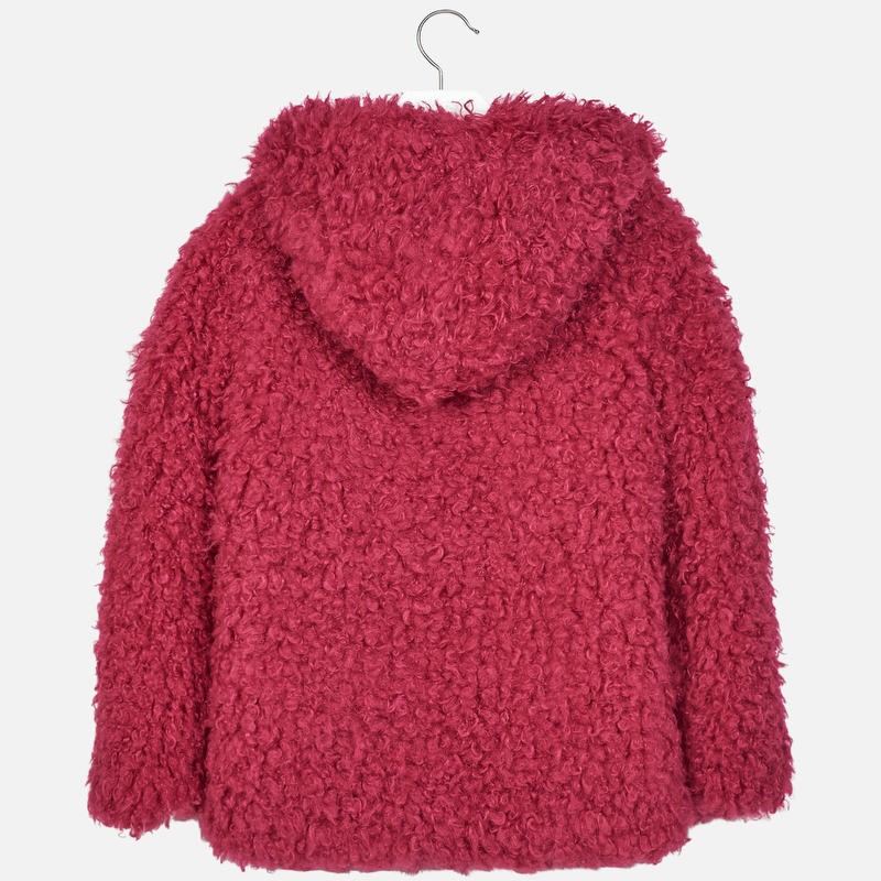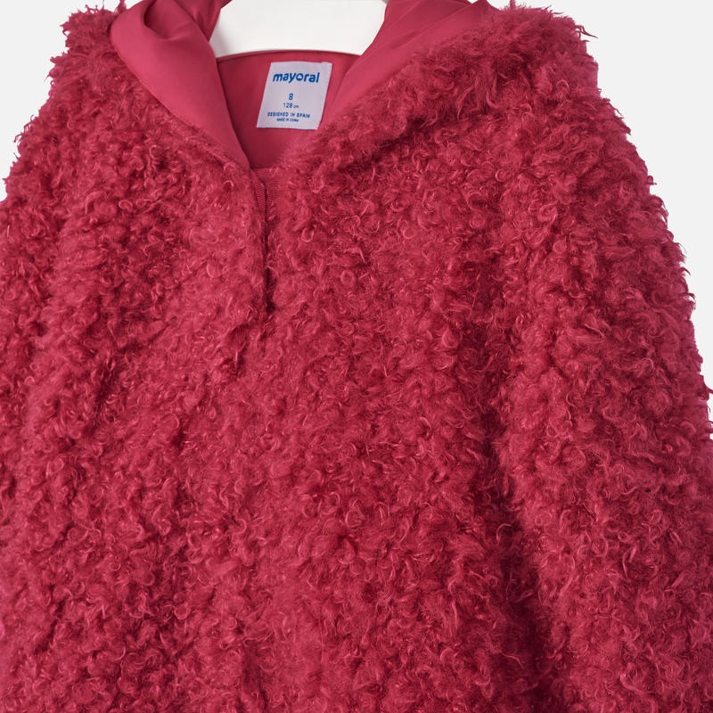 Mayoral children's clothing. Fur coat with hood from the junior girl collection from the fall winter season. Manufacturer's product code 7416 color 28 Fuchsia.
