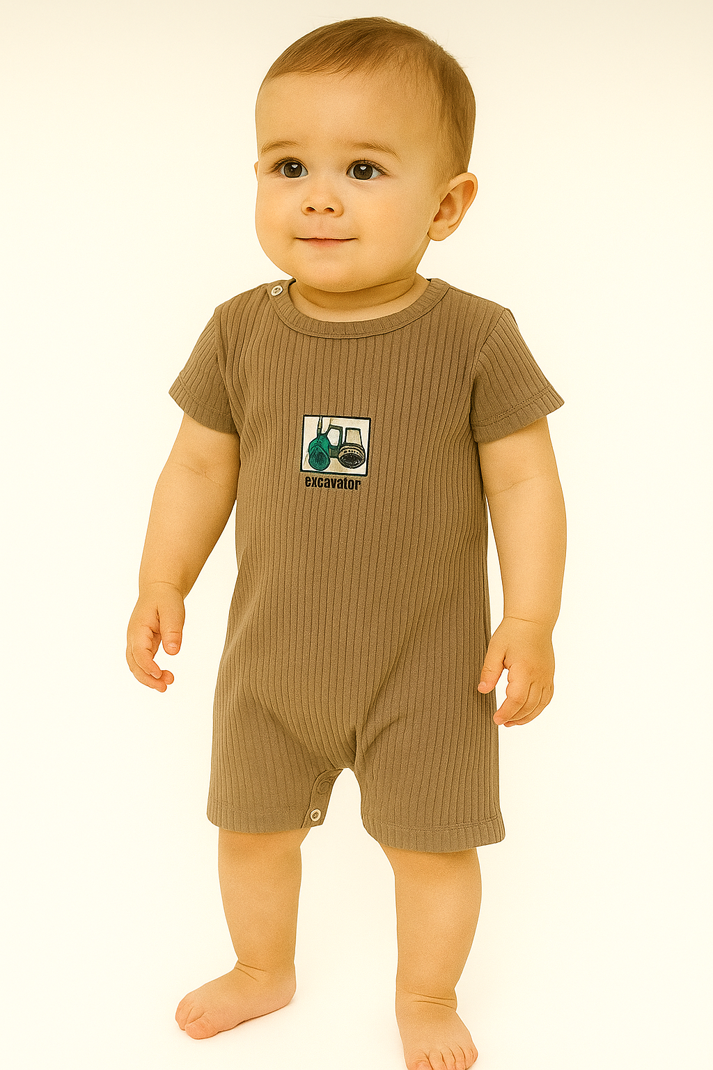 We present a boys' romper with a tractor motif by Pokipo, product number 3013-5625, in brown . This charming romper is the perfect choice for the spring-summer season. Made of a pleasant, soft material, it provides comfort and convenience. It features a snap closure for easy dressing and practical pockets . Its fashionable design and functionality make it a great choice for any little explorer.