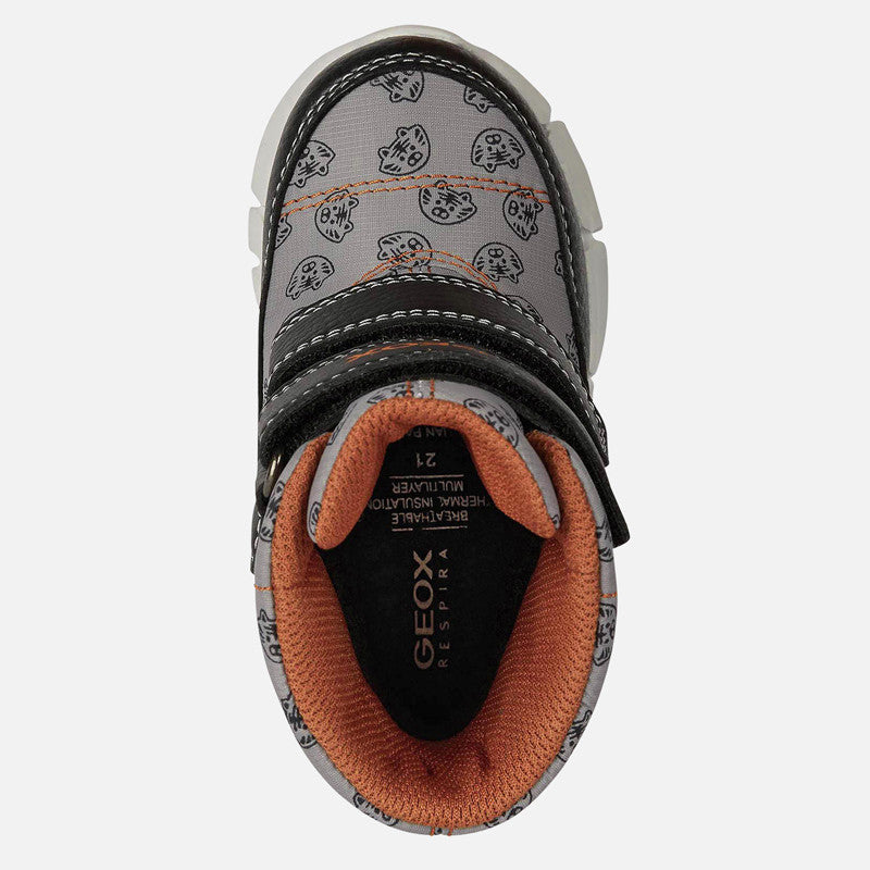 Geox Amphibiox B043PC-0MNBU-C0036 boys' snow boots are the perfect choice for your child on cold and wet days. These unique winter boots combine excellent quality with stylish design, providing the youngest with both warmth and comfort during even the most demanding winter fun. Gray color with expressive orange accents and cute animal motifs with a tiger make these snow boots loved by both boys and their parents.