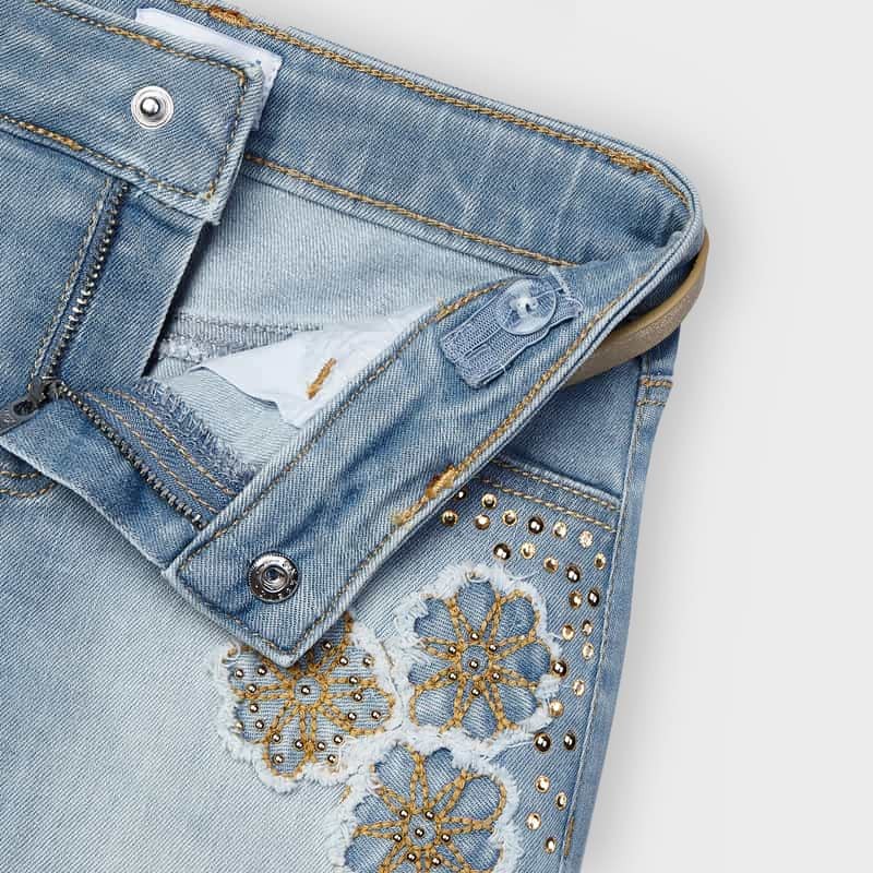 Children's denim skirt with belt, rhinestones and embroidery girl Mayoral from the Mini girl collection from the spring-summer season product code 3904 color 37 Sky blue. Children's clothing.