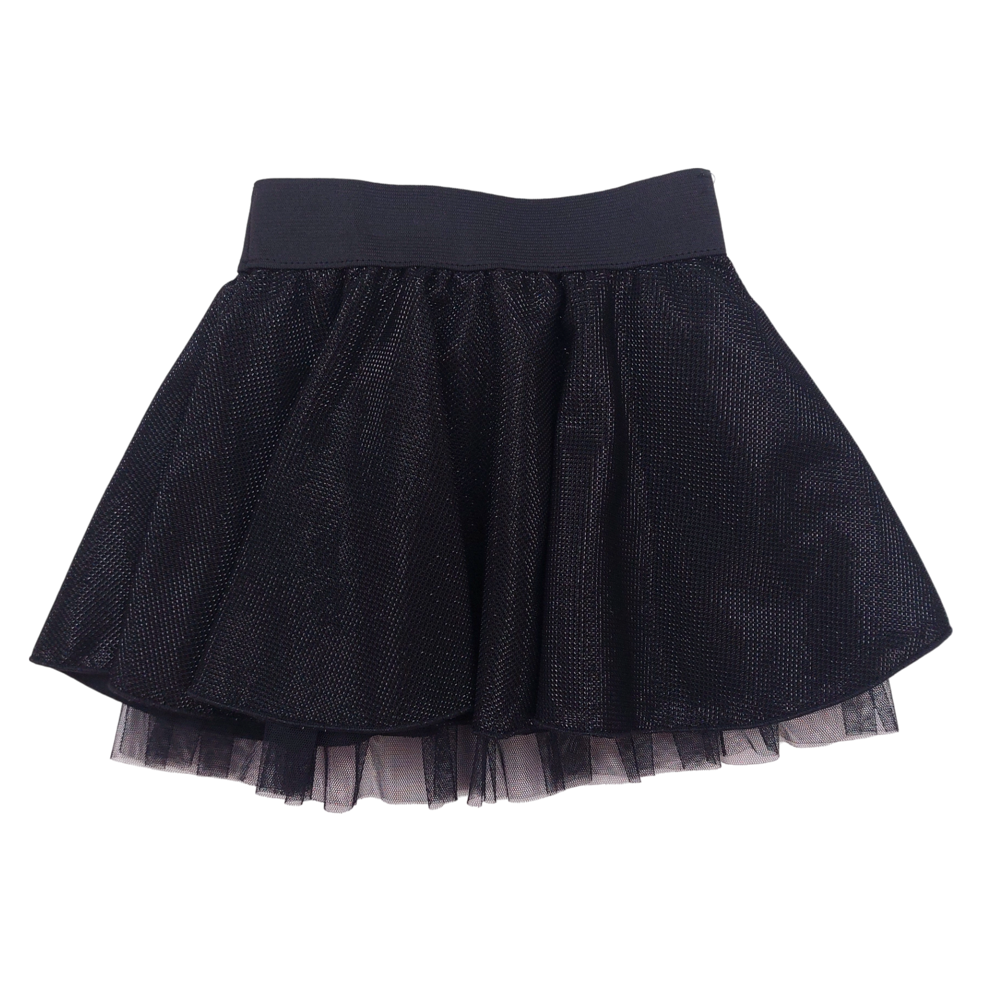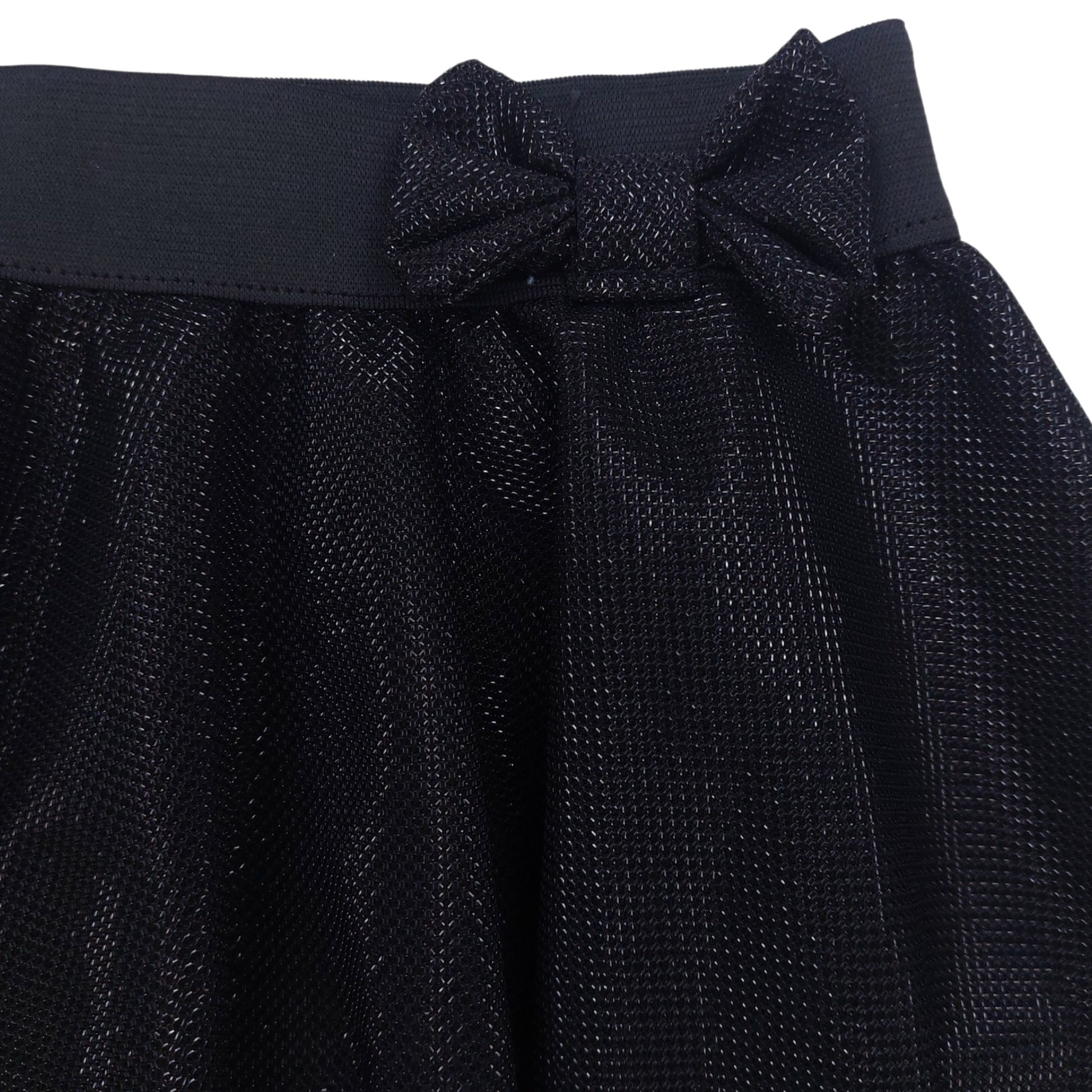 Elegant skirt for girls made of shiny material in black, perfect for special occasions in the autumn-winter season. Model decorated with a subtle bow at the waist, with a layered tulle lining that adds volume and an effective look. Size range 92-122.