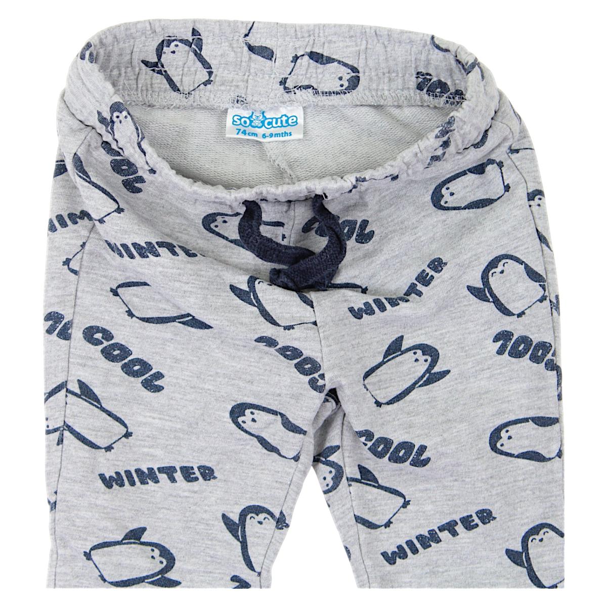 We present gray pants that are perfect for any boy. Made of durable cotton , they provide comfort and freedom of movement. They feature practical pockets for storing small items. An elastic waistband with a drawstring makes them easy to adjust. The fabric features a child-friendly penguin pattern that is sure to appeal to young fashionistas.