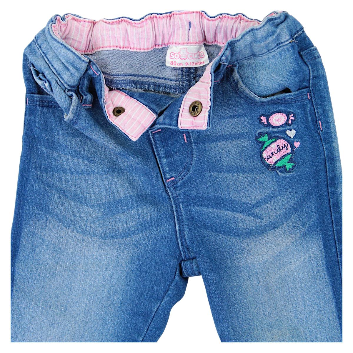 We offer blue pants for girls that combine style and comfort. The front of the pants is designed with functionality in mind, featuring colorful candy embroidery , making them appealing to younger wearers. The leg length has been adjusted to children's needs, ensuring comfort during play. The back of the pants is straight, adding to the versatility of the style. A button closure and additional belt loops ensure a perfect fit. This is a great option for girls who value a fashionable look and everyday comfort. These pants are designed for children and are perfect for a variety of situations – from playtime to family outings. There's no doubt that this product will become a favorite in any child's wardrobe.