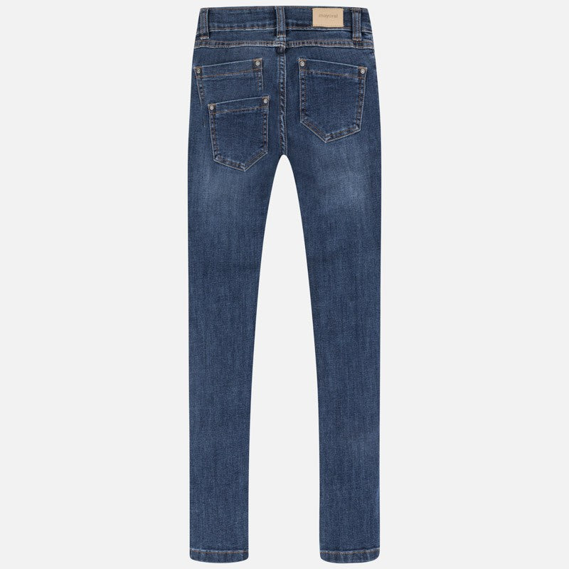 Long denim trousers for children with pockets and rhinestones for girls Mayoral from the junior girl collection from the spring summer season product code 6530 color 86 Dark jeans. Clothing for young children.