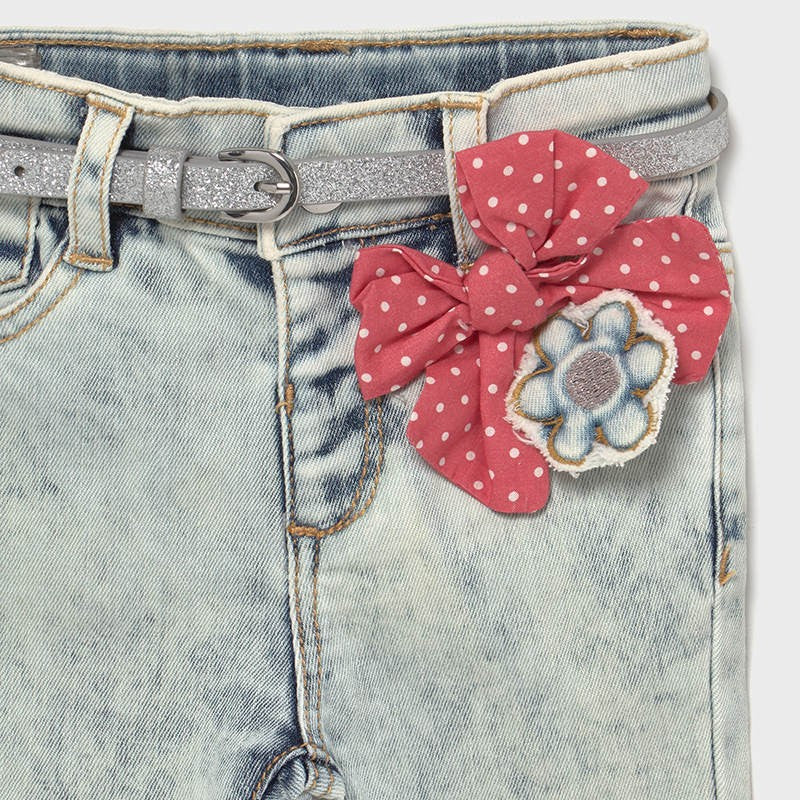 Long jeans for children with a belt and a decorative application for a girl Mayoral from the baby girl collection from the spring-summer season, product code 1577, color 51 Sky blue. Children's clothing.