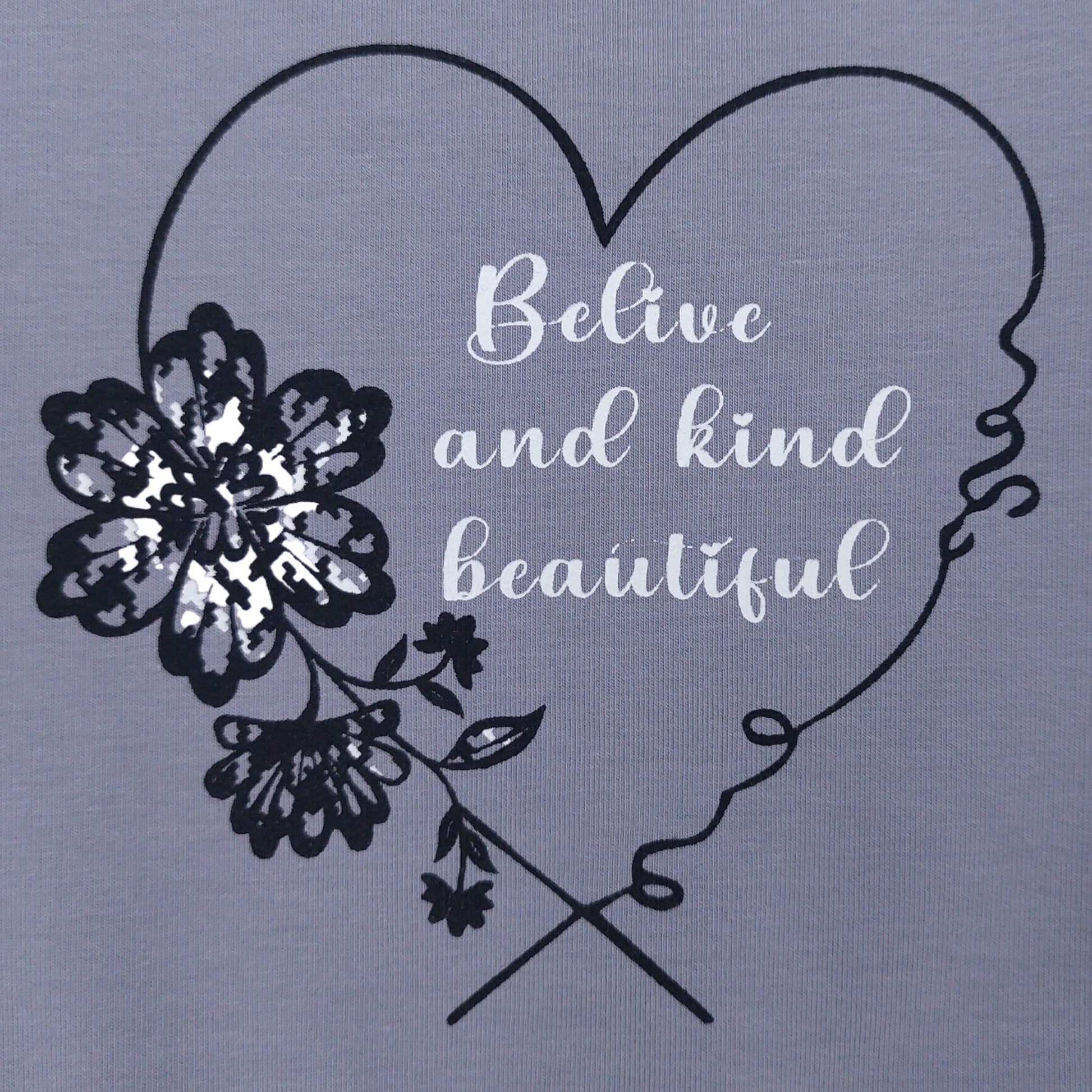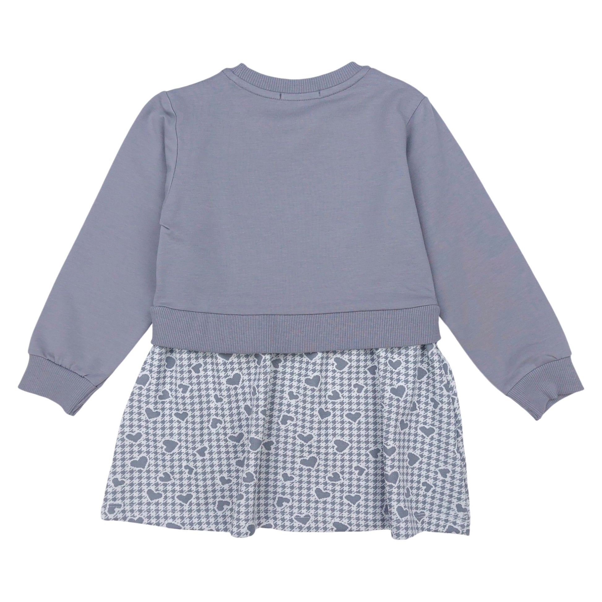 Girls' dress in gray color for the fall-winter season, combines the comfort of a sweatshirt with a decorative heart print and the inscription "Believe and kind beautiful". The lower part is made of delicate material in a subtle heart pattern. The dress has long sleeves , no pockets or fasteners, put on over the head. Perfect for everyday use, both for fun and walks.