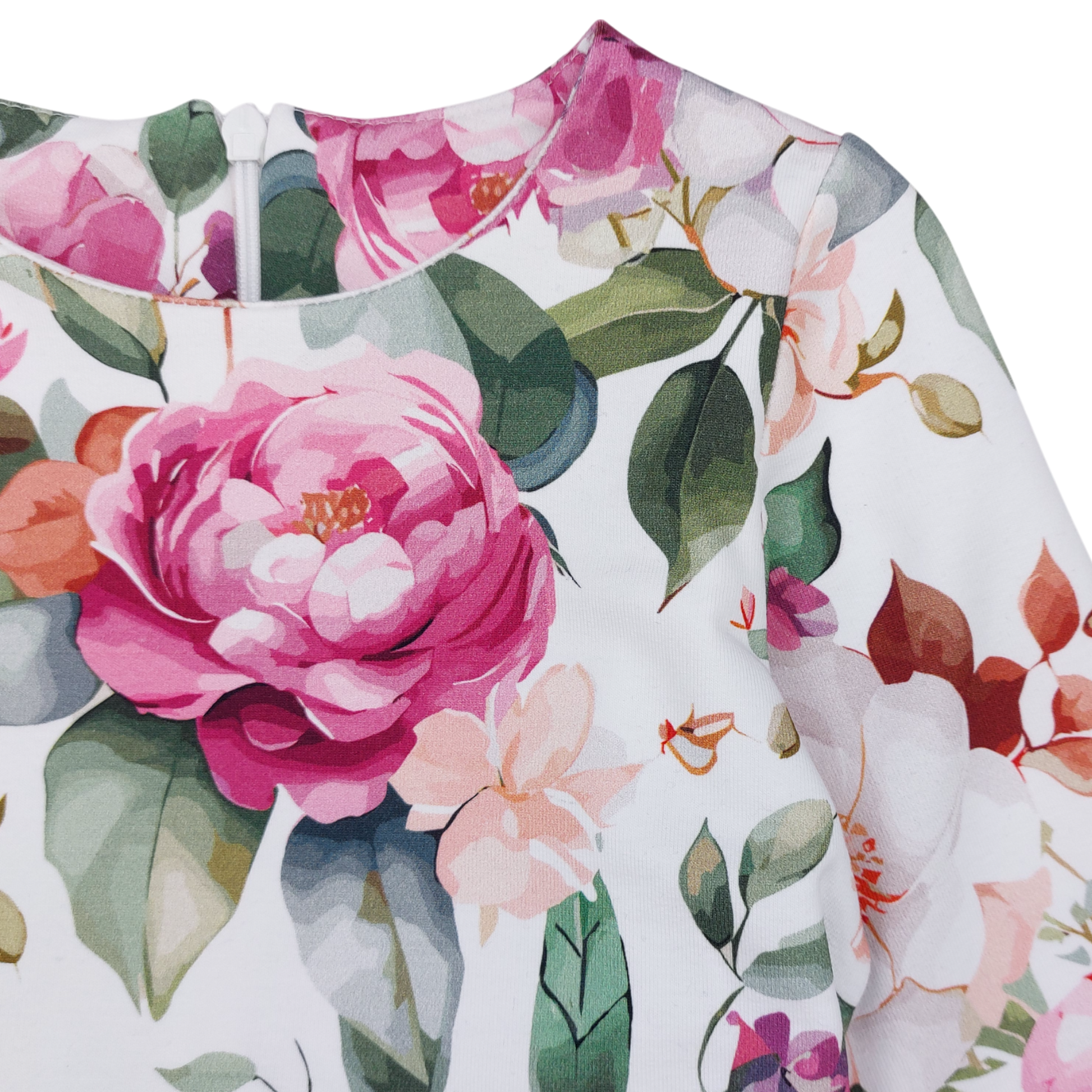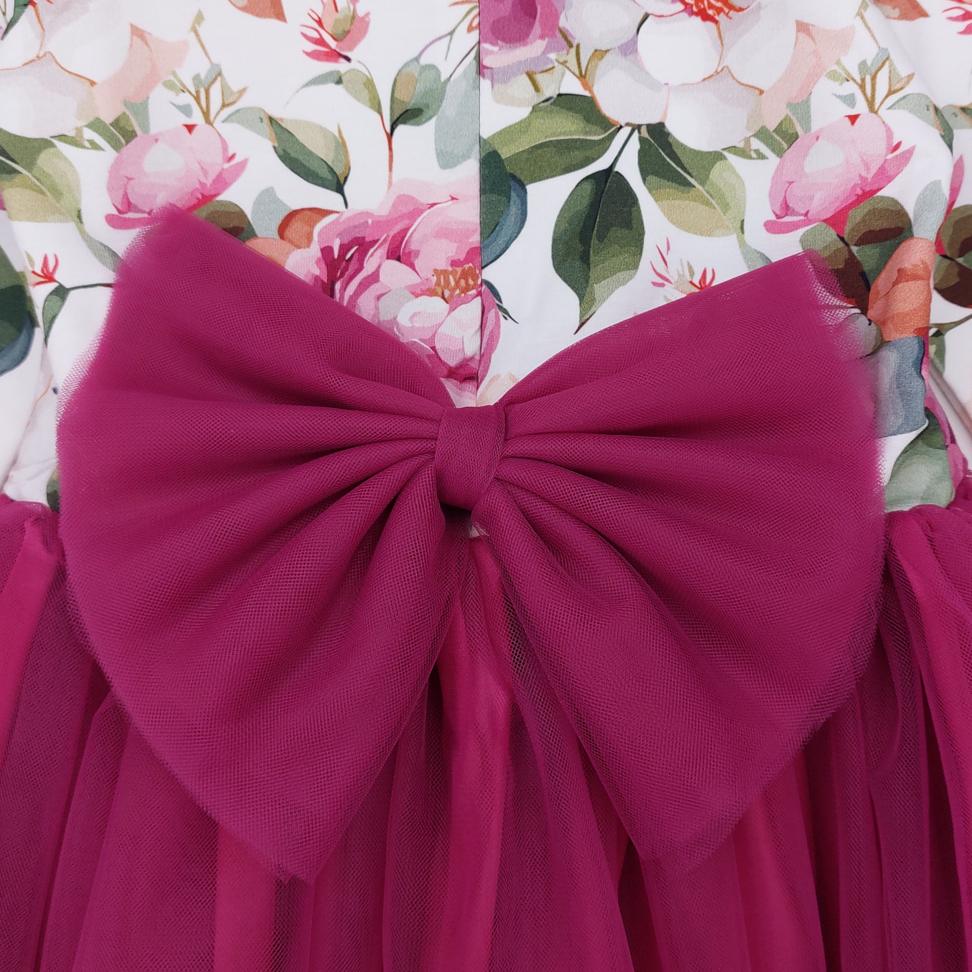 Katerina girl's dress in fuchsia color is a perfect choice for special occasions. The top of the dress is made of material in a floral pattern , while the bottom is decorated with an effective layered tulle skirt . The model has long sleeves and a large bow at the back, which adds elegance and charm. The dress is fastened with a hidden zipper at the back, which makes it easy to put on. Perfect for celebrations such as holidays, weddings or birthdays.