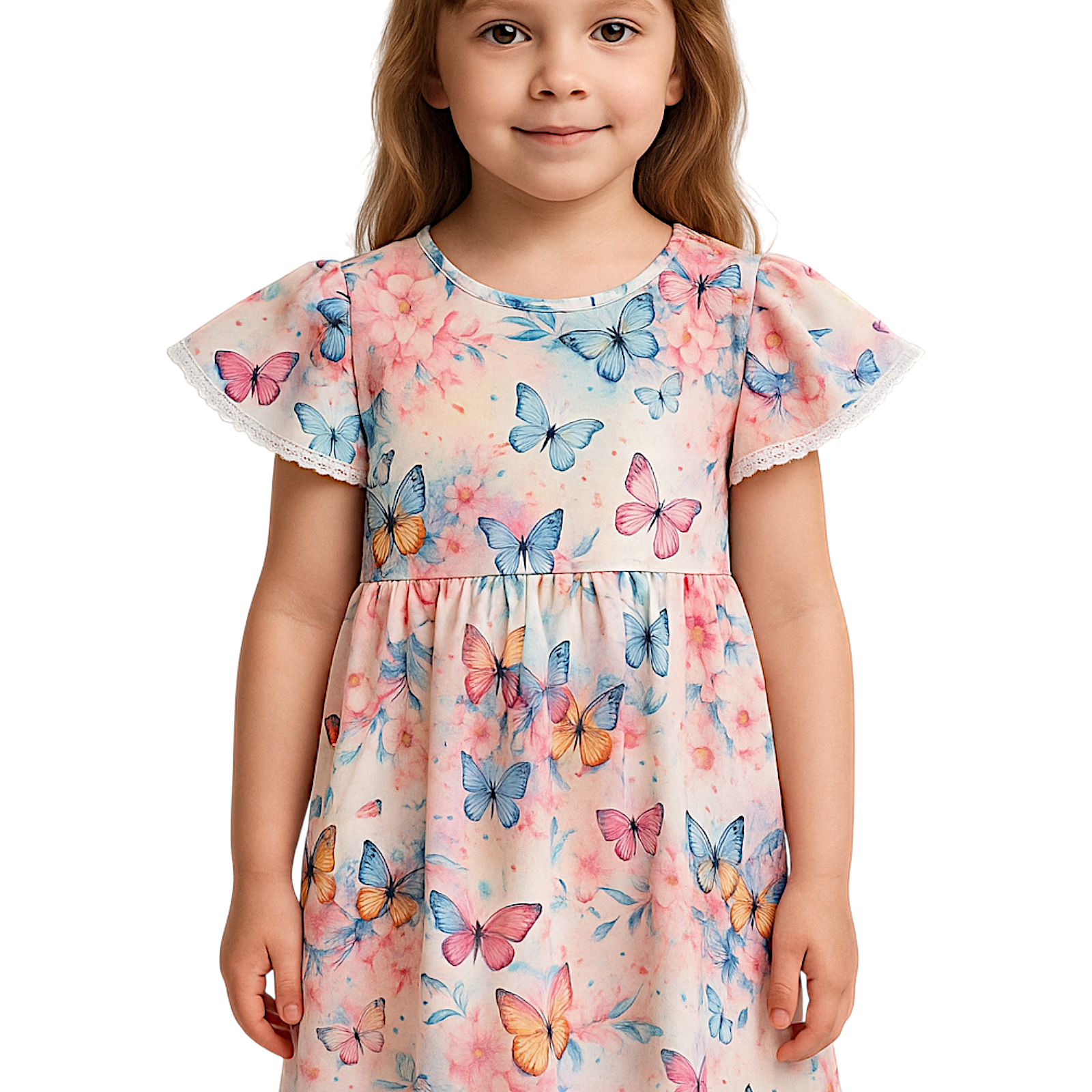 The girly pink butterfly dress from Guliwerkids is the perfect choice for warmer days. Made of soft material, it ensures comfort . The subtle butterfly pattern adds charm, and the loose fit allows for freedom of movement. The dress has delicate straps and no pockets or zippers. It's lightweight and airy, perfect for spring walks and summer parties.