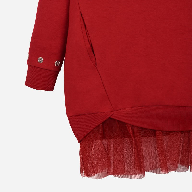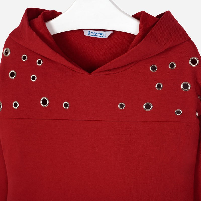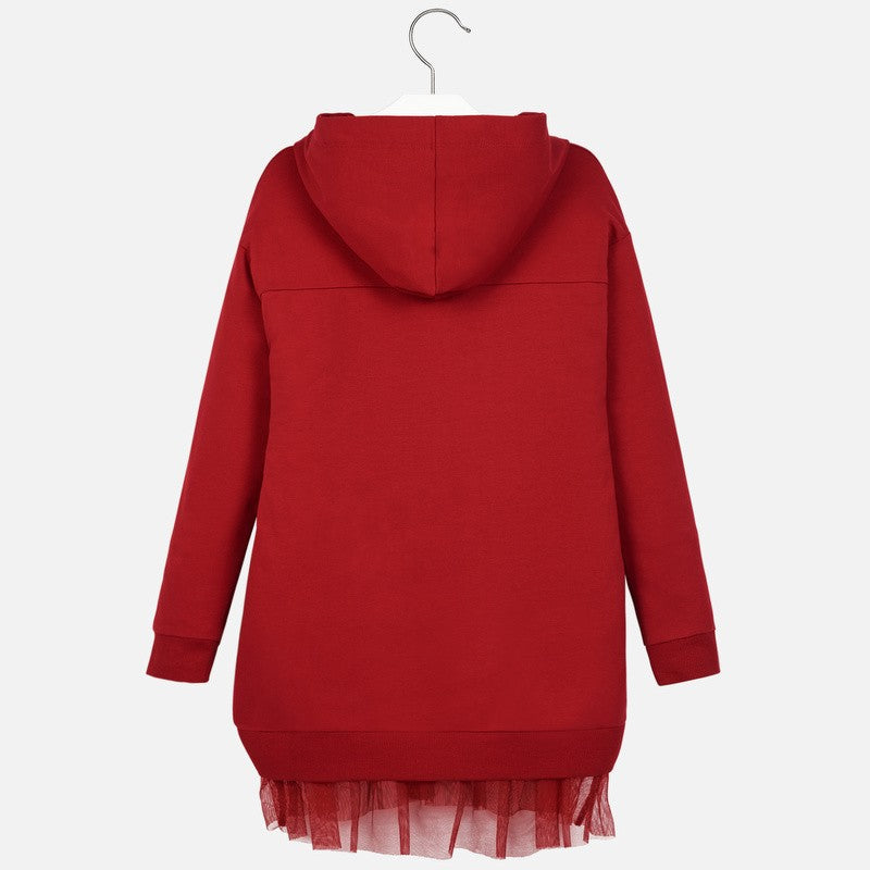 Mayoral children's clothing. Sports dress with hood and tulle from the junior girl collection from the fall winter season. Manufacturer's product code 7942 color 62 Red.