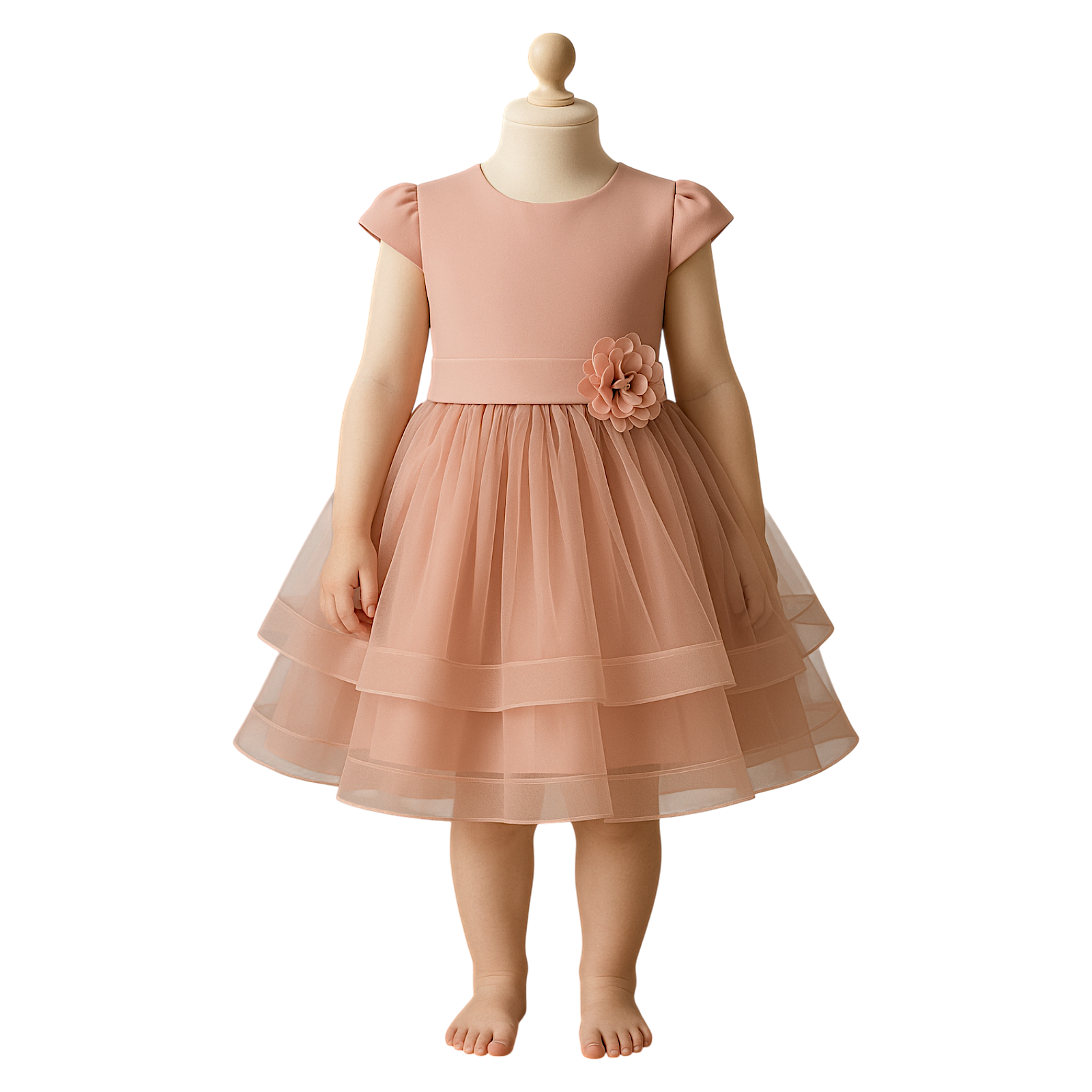 The front of the dress features a classic cut with a round neckline, perfectly emphasizing the innocence and grace of a child. The back zipper fastens, making it easy to put on and take off. A significant feature is the small, delicately gathered sleeves, which add even more charm. This girly dress is versatile and can be paired with a variety of accessories to create a memorable look for any occasion.