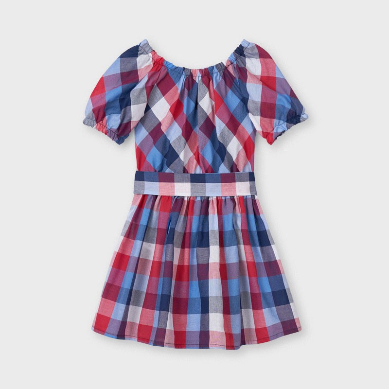 Checked dress for children with short sleeves tied at the waist girl Mayoral from the Mini girl collection from the spring-summer season product code 3948 color 3 red/blue. Children's clothing.