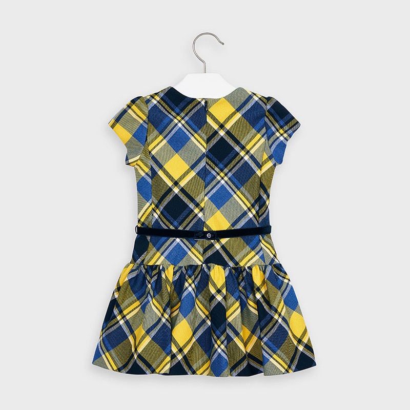 Checkered dress for children with short sleeves and a decorative belt for girls Mayoral from the Mini girl collection from the fall-winter season, product code 4974, color 42 Yellow. Children's clothing.