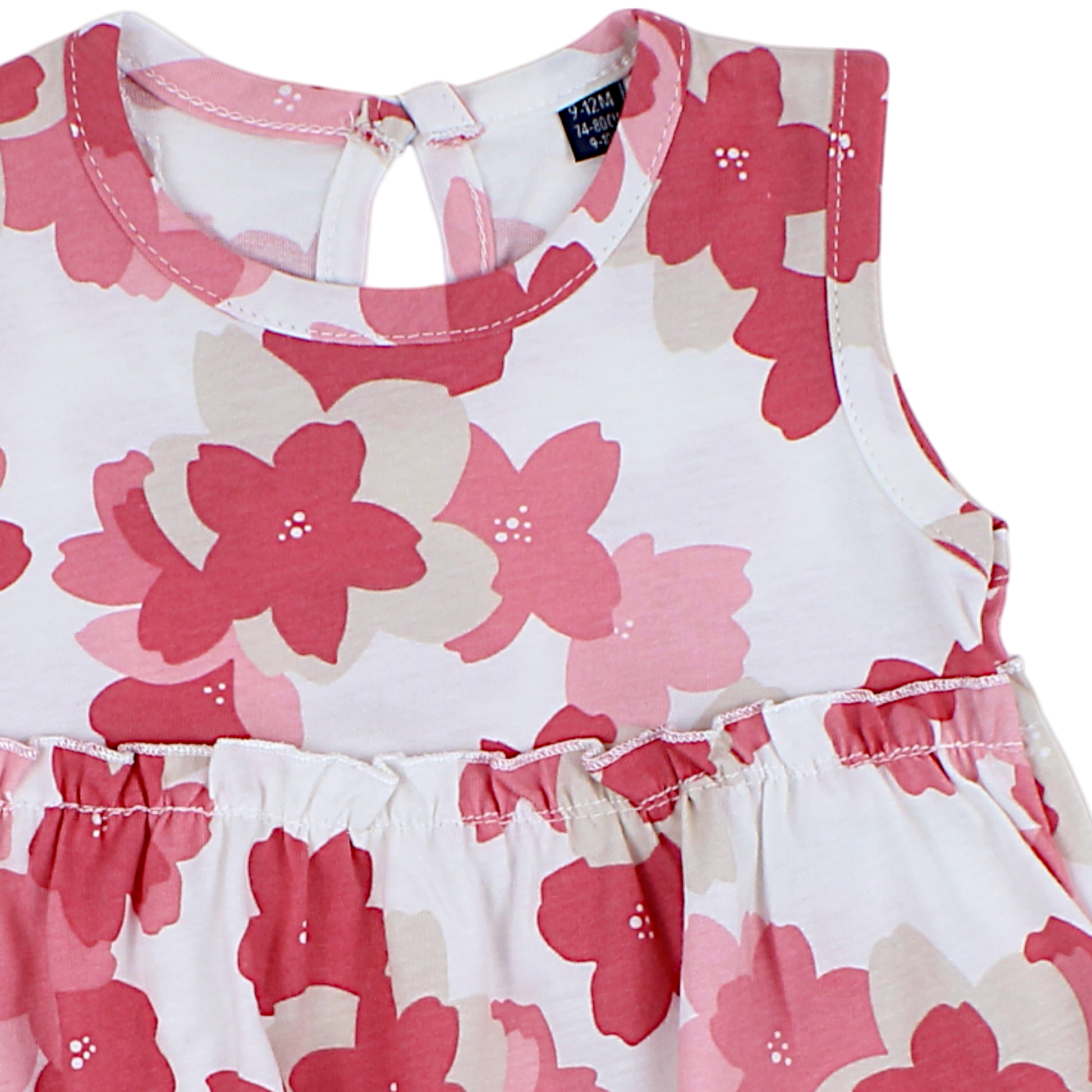 The dress's eye-catching details, featuring delicate floral patterns, add a unique charm and make your little one look exceptional. The knee- length dress allows for free play without worrying about comfort or mobility. The sleeveless design makes it a perfect choice for warm summer days, and its cut allows for complete freedom of movement.