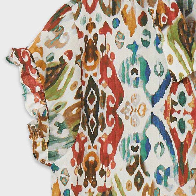 Patterned dress for children, unbuttoned, with short sleeves and a collar, girl Mayoral, from the junior girl collection, spring-summer season, product code 6940, color 4, green. Clothing for children's youth.